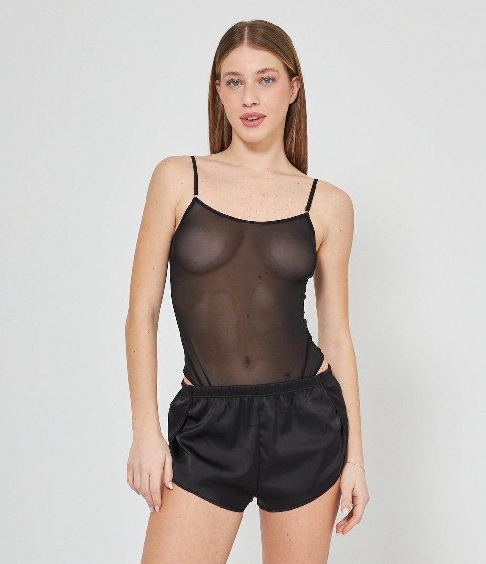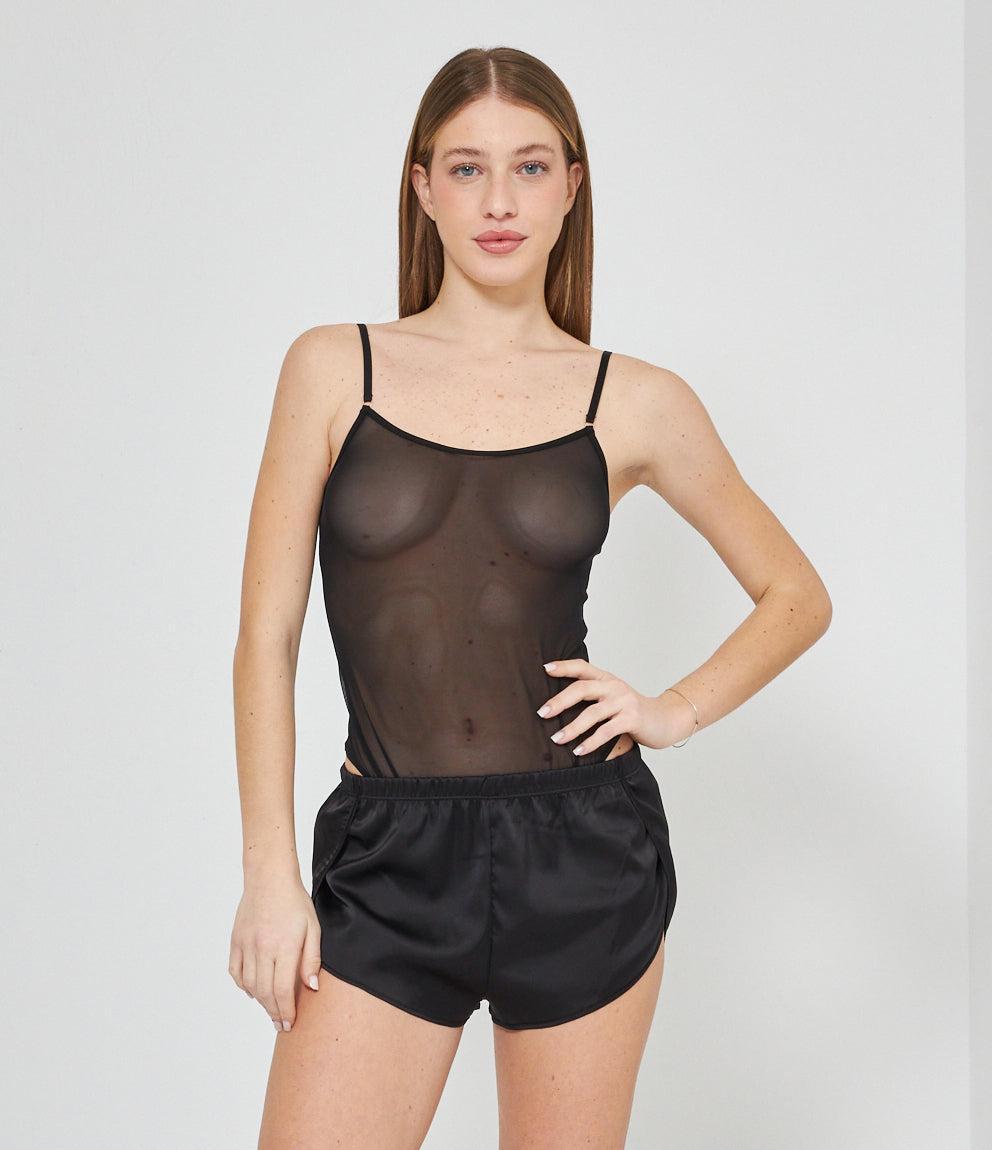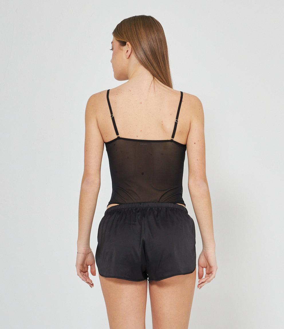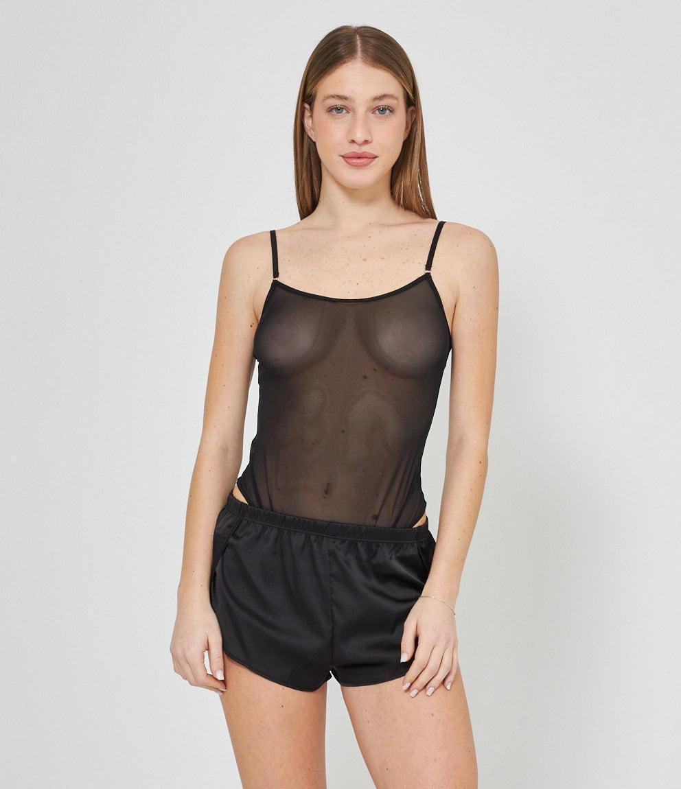 Body in microrete, scollo ampio e spalline regolabili. Chiusura con bottoni.