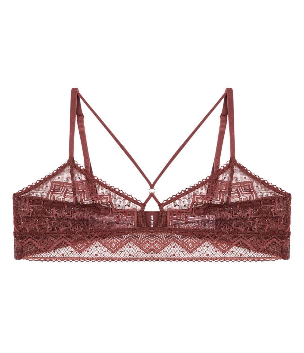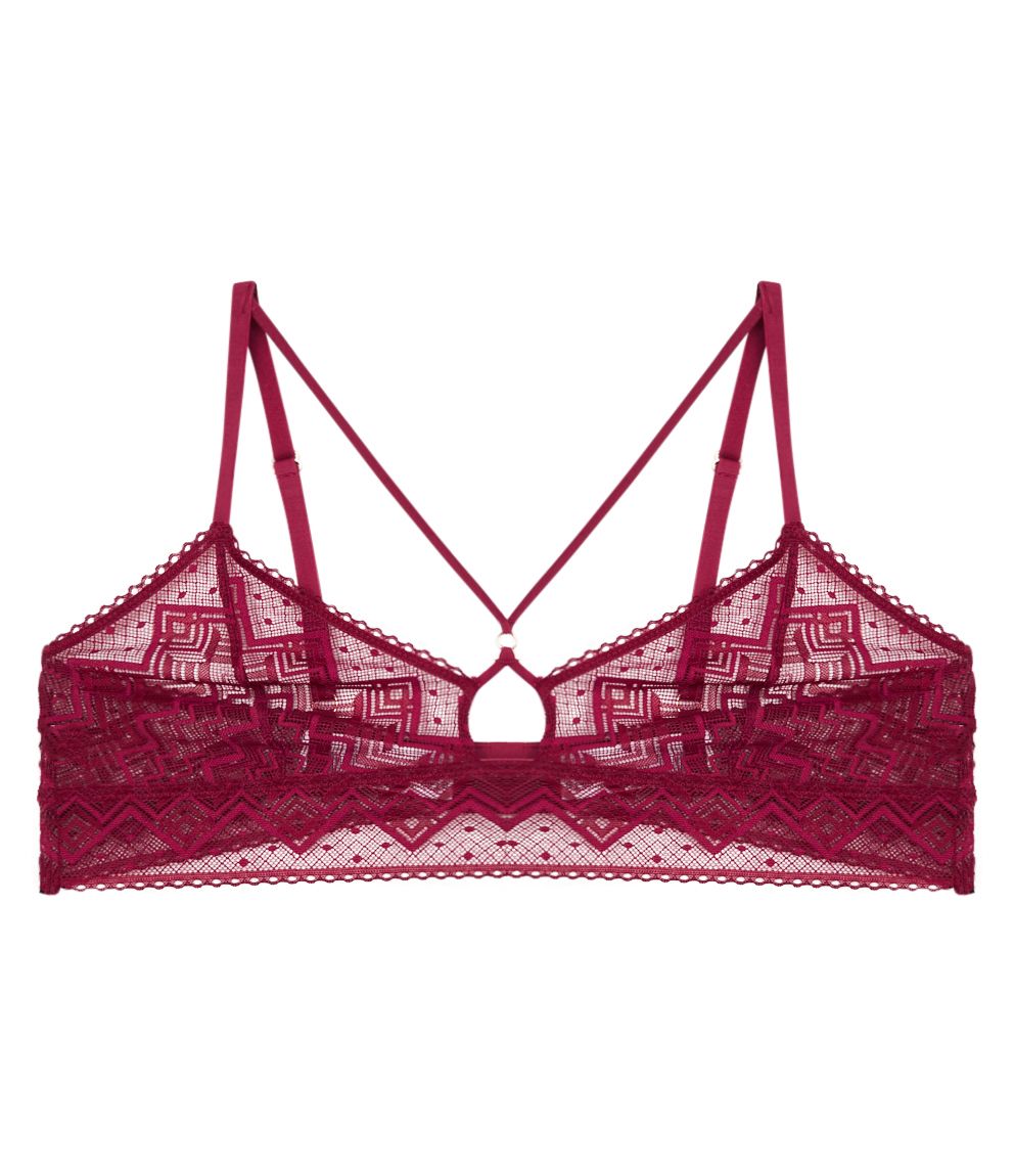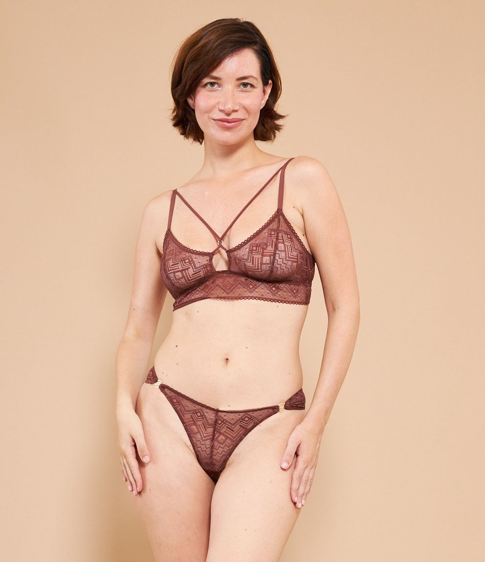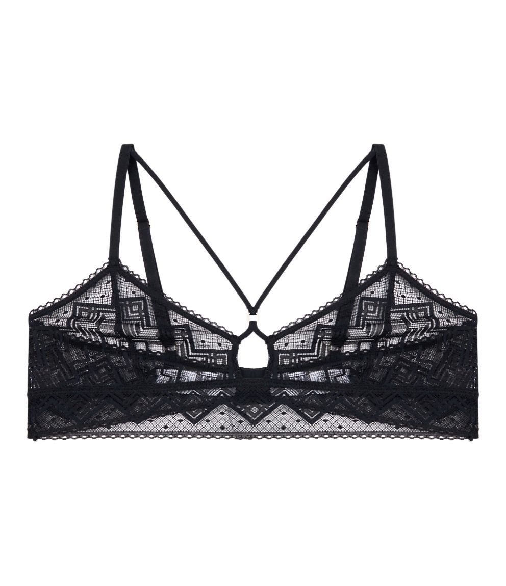 Bralette in pizzo geometrico con dettaglio fasce frontali. Spalline regolabili e chiusura con gancetti regolabili in tre larghezze.