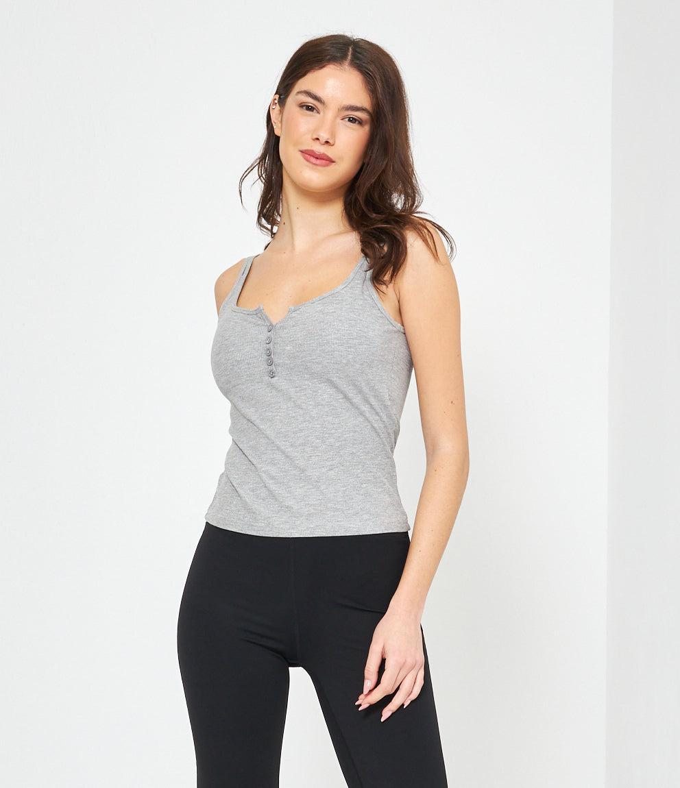 Canotta in tessuto a coste con scollo a cuore e chiusura frontale con piccoli bottoni decorativi. Presenta spalline sottili e vestibilità aderente che segue le forme del corpo. Orlo dritto a vita bassa per un look casual e femminile.
