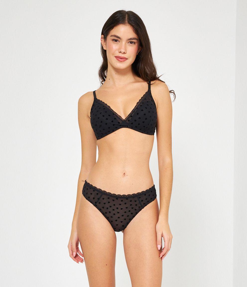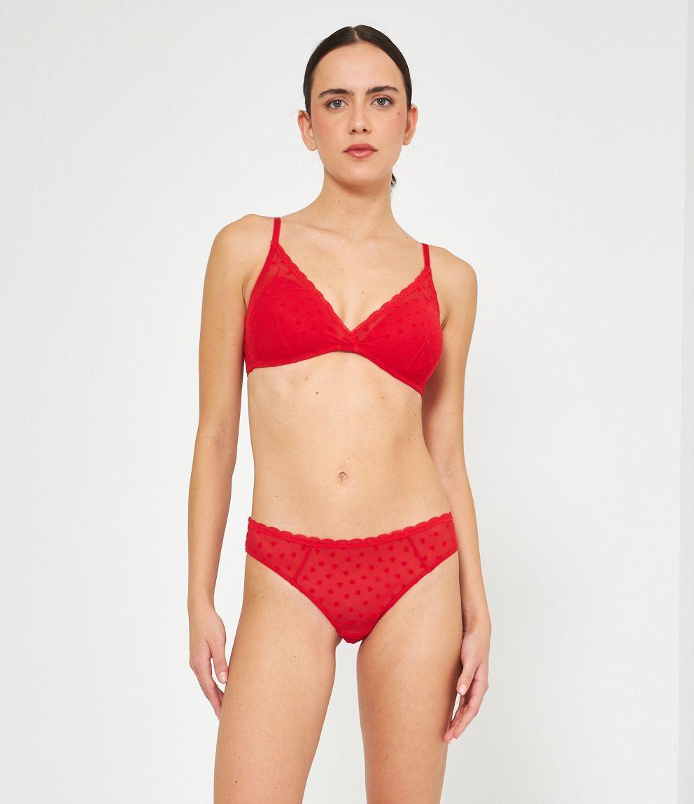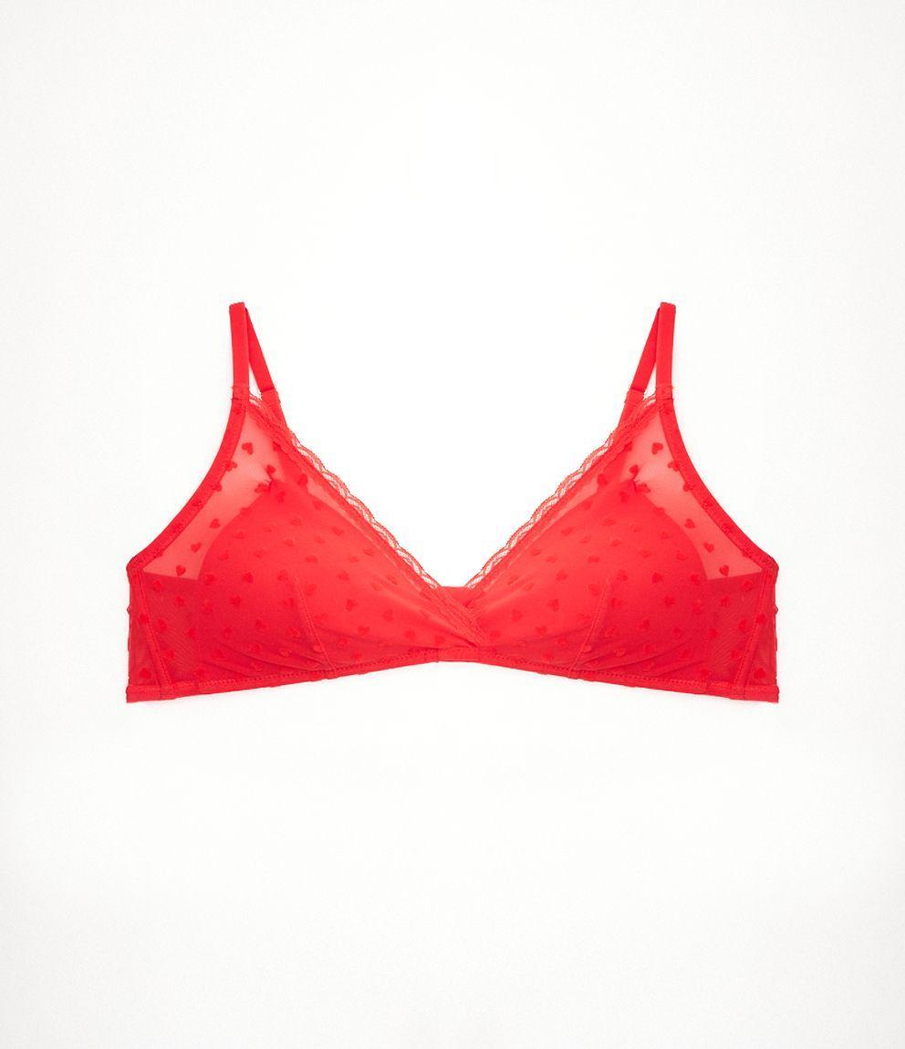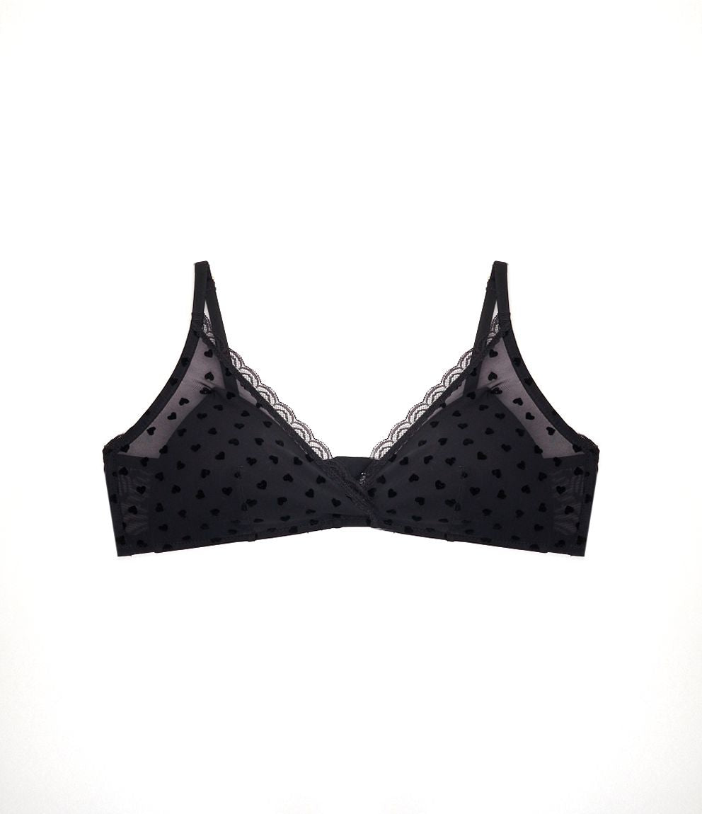 Reggiseno bralette in pizzo con cuori a rilievo e bordo ondulato.. Spalline regolabili e chiusura con tra ganci regolabili su tre lunghezze.