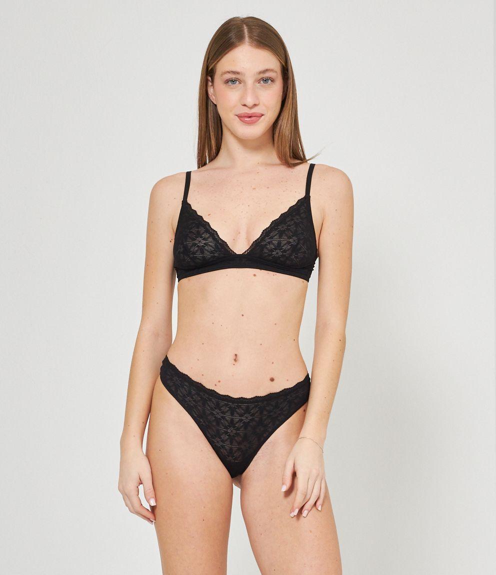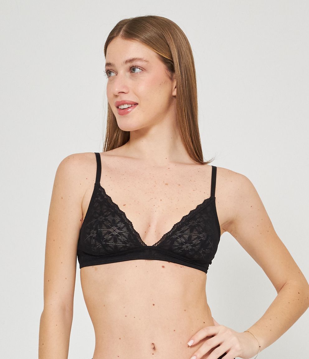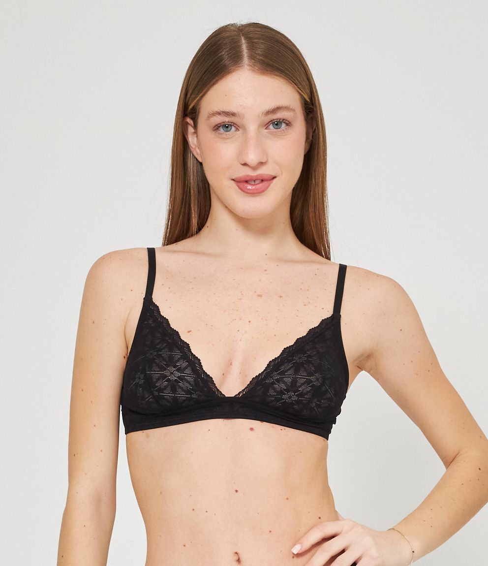 Reggiseno modello triangolo, ricamato senza coppe e senza ferretto. Spalline regolabili e chiusura con due gancetti regolabili in tre larghezze.