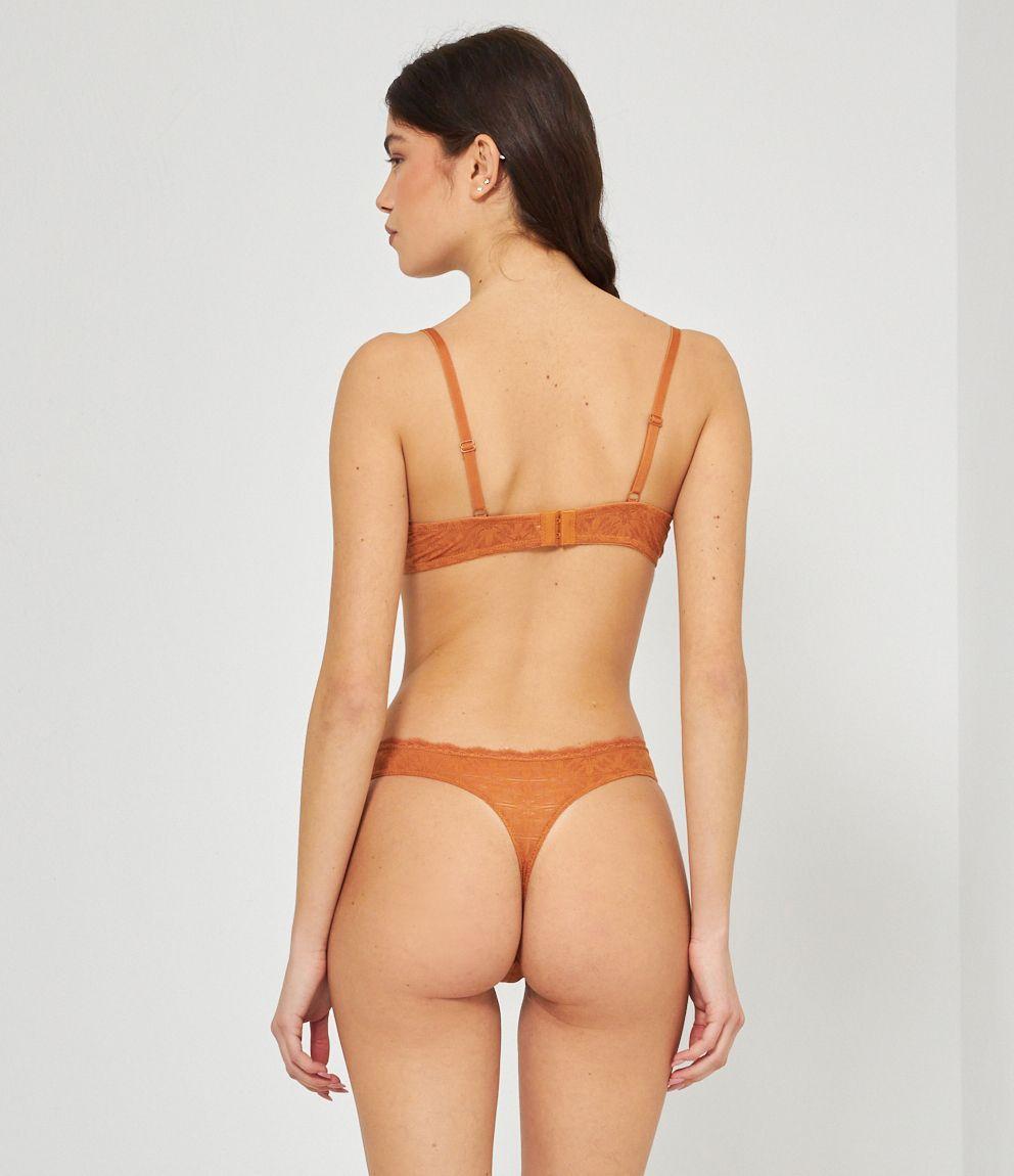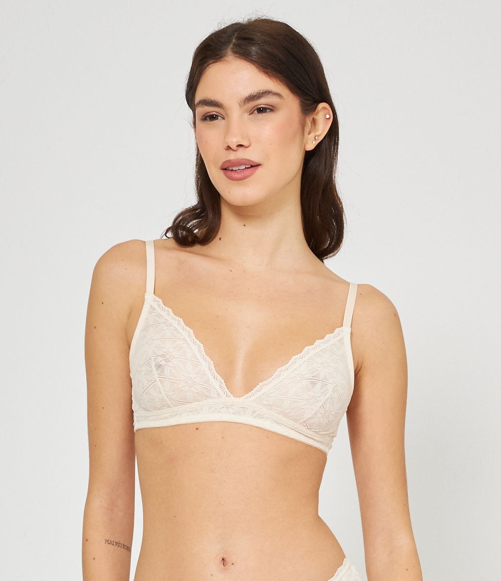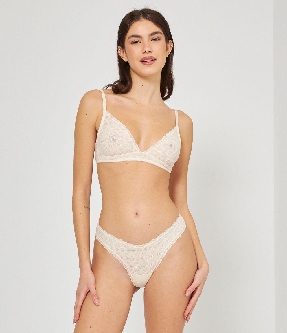 Reggiseno modello triangolo, ricamato senza coppe e senza ferretto. Spalline regolabili e chiusura con due gancetti regolabili in tre larghezze.