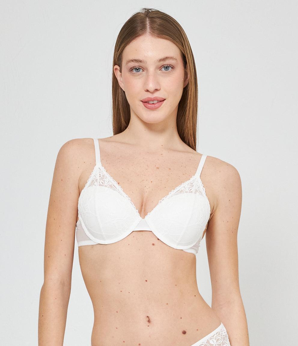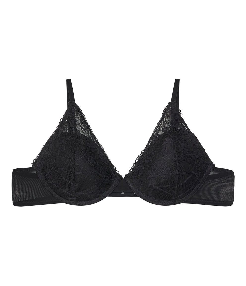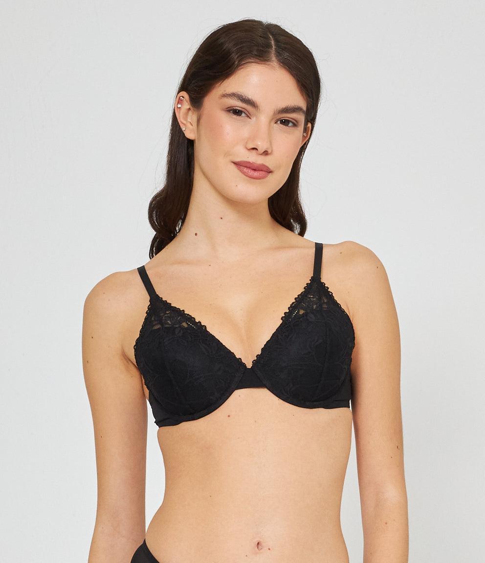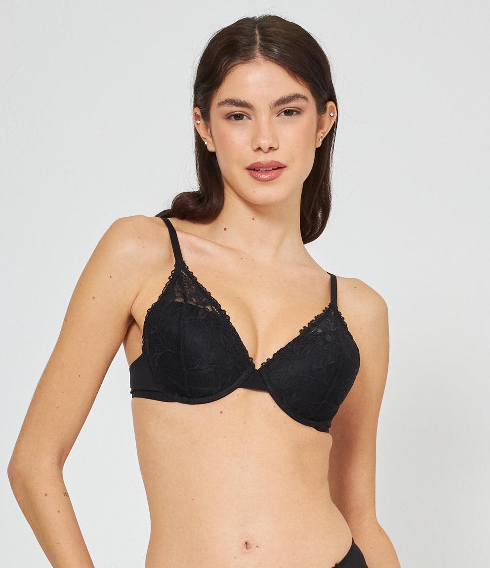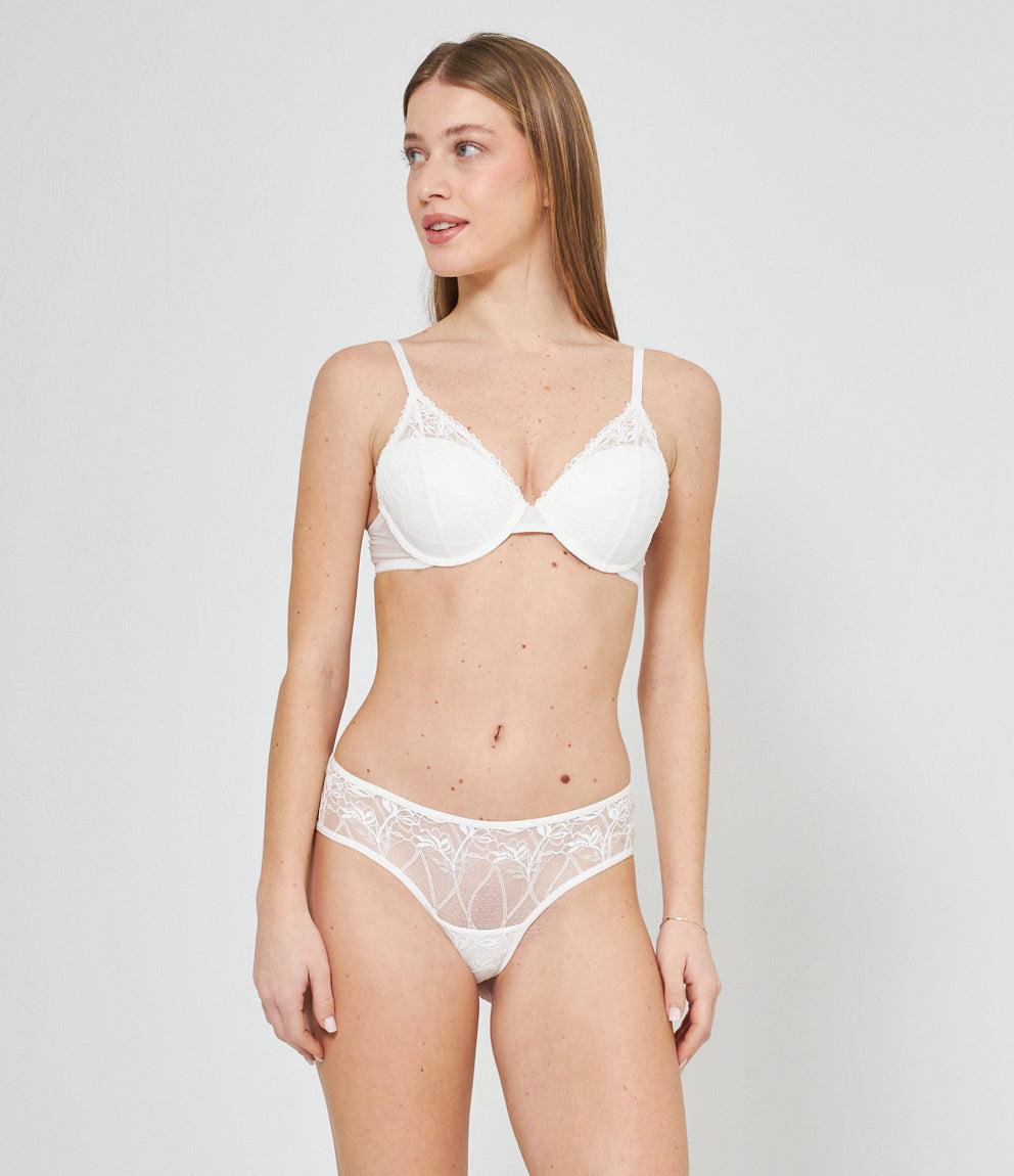 Reggiseno in pizzo con trasparenze, modello a balconcino con ferretto e coppe imbottite. Spalline regolabili e chiusura con due gancetti regolabili in tre larghezze.