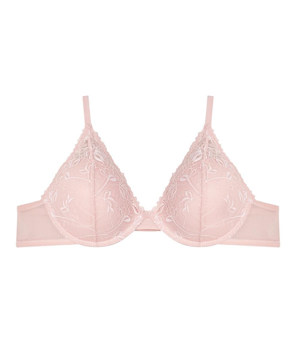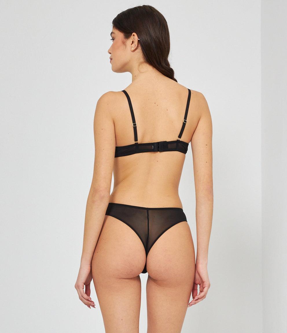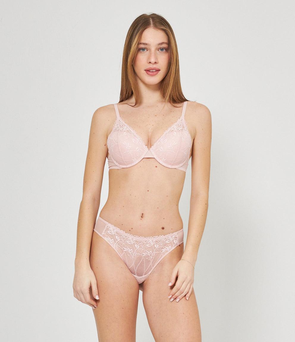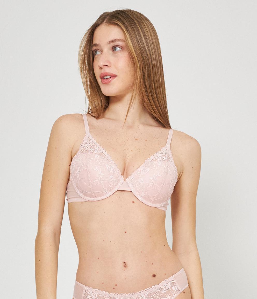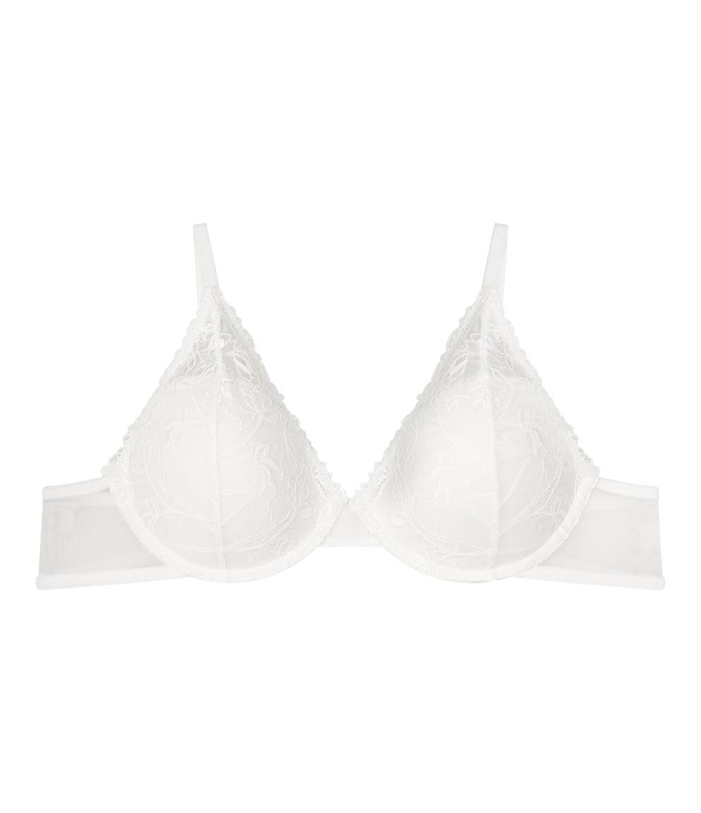 Reggiseno in pizzo con trasparenze, modello a balconcino con ferretto e coppe imbottite. Spalline regolabili e chiusura con due gancetti regolabili in tre larghezze.
