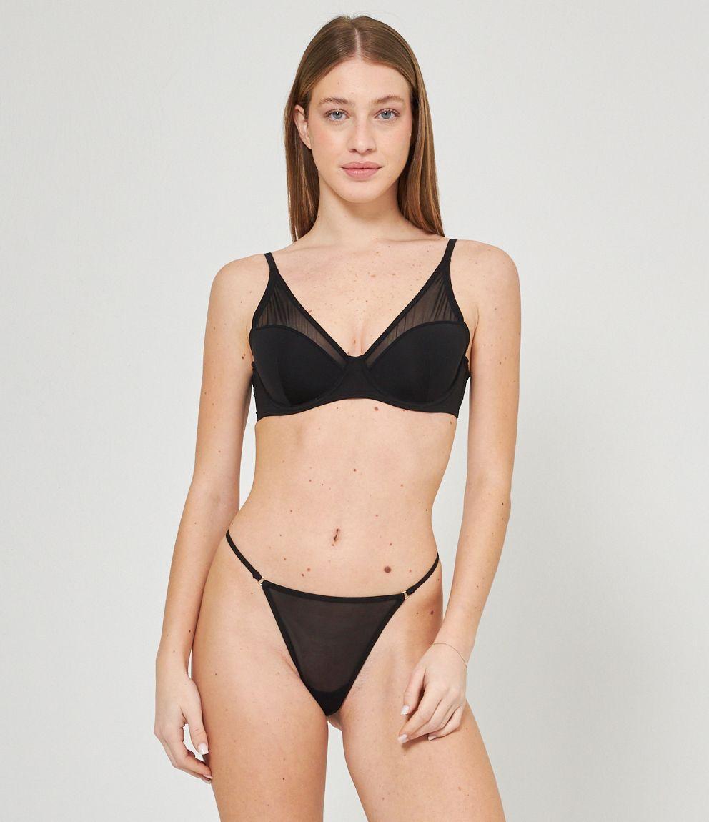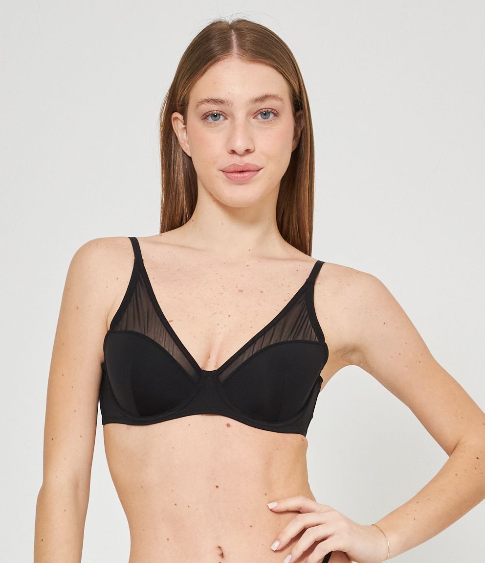 Reggiseno modello push up con dettaglio in microrete, spalline regolabili e chiusura con due gancetti regolabili in tre larghezze.