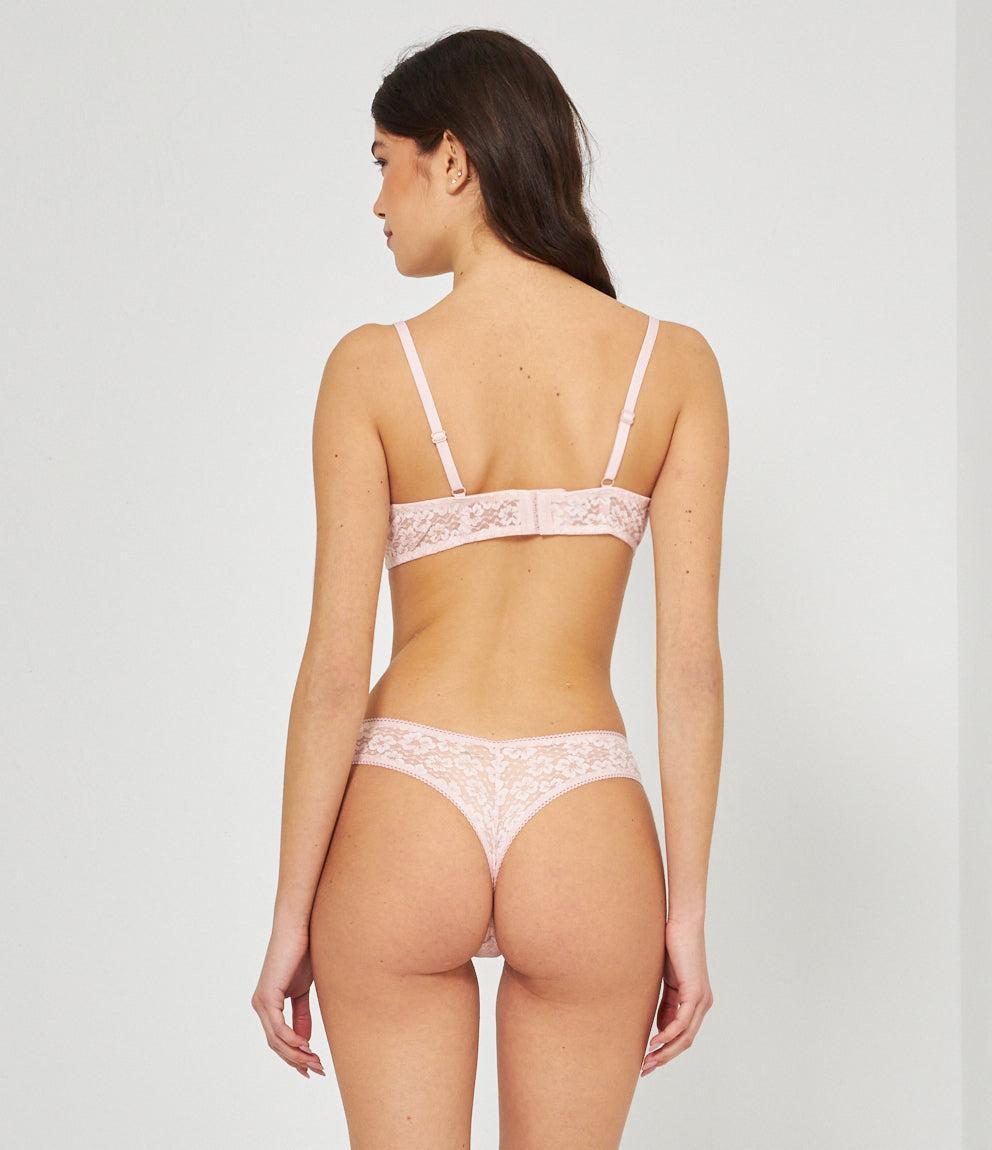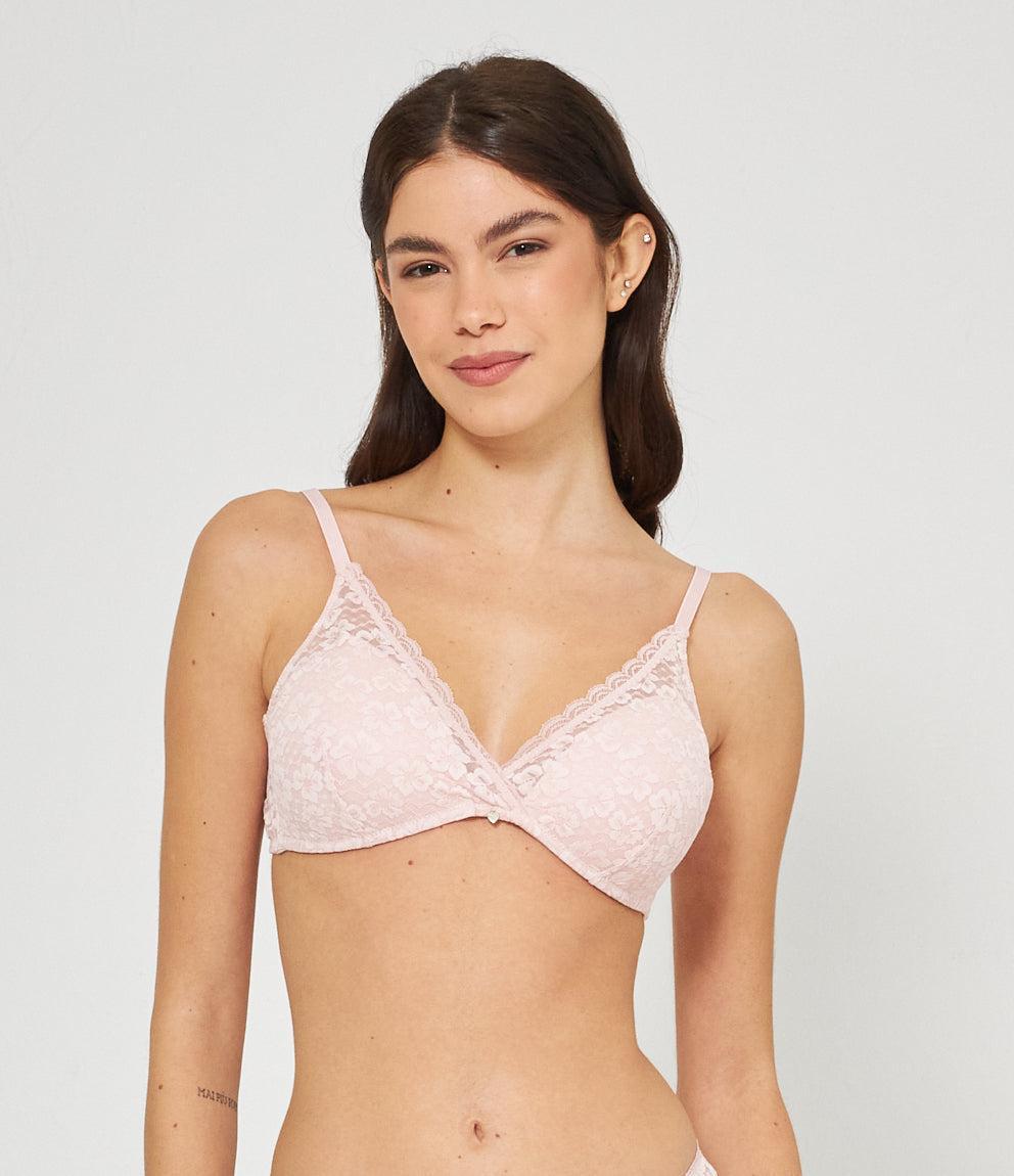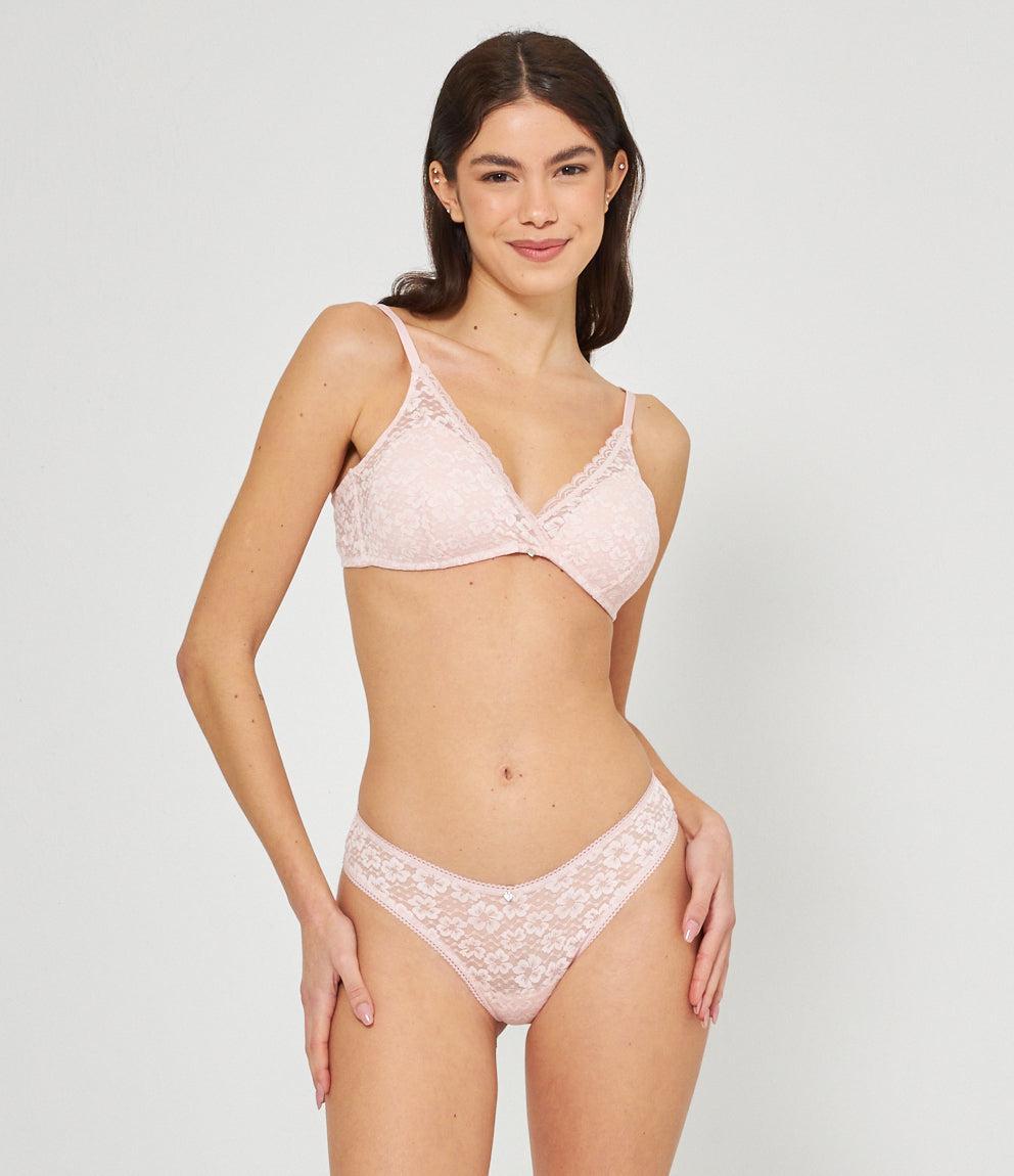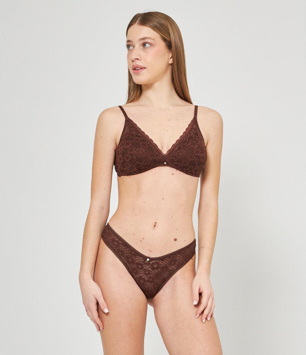 Bralette in pizzo, modello a triangolo con spalline sottili regolabili e chiusura con tre gancetti regolabili in tre larghezze.