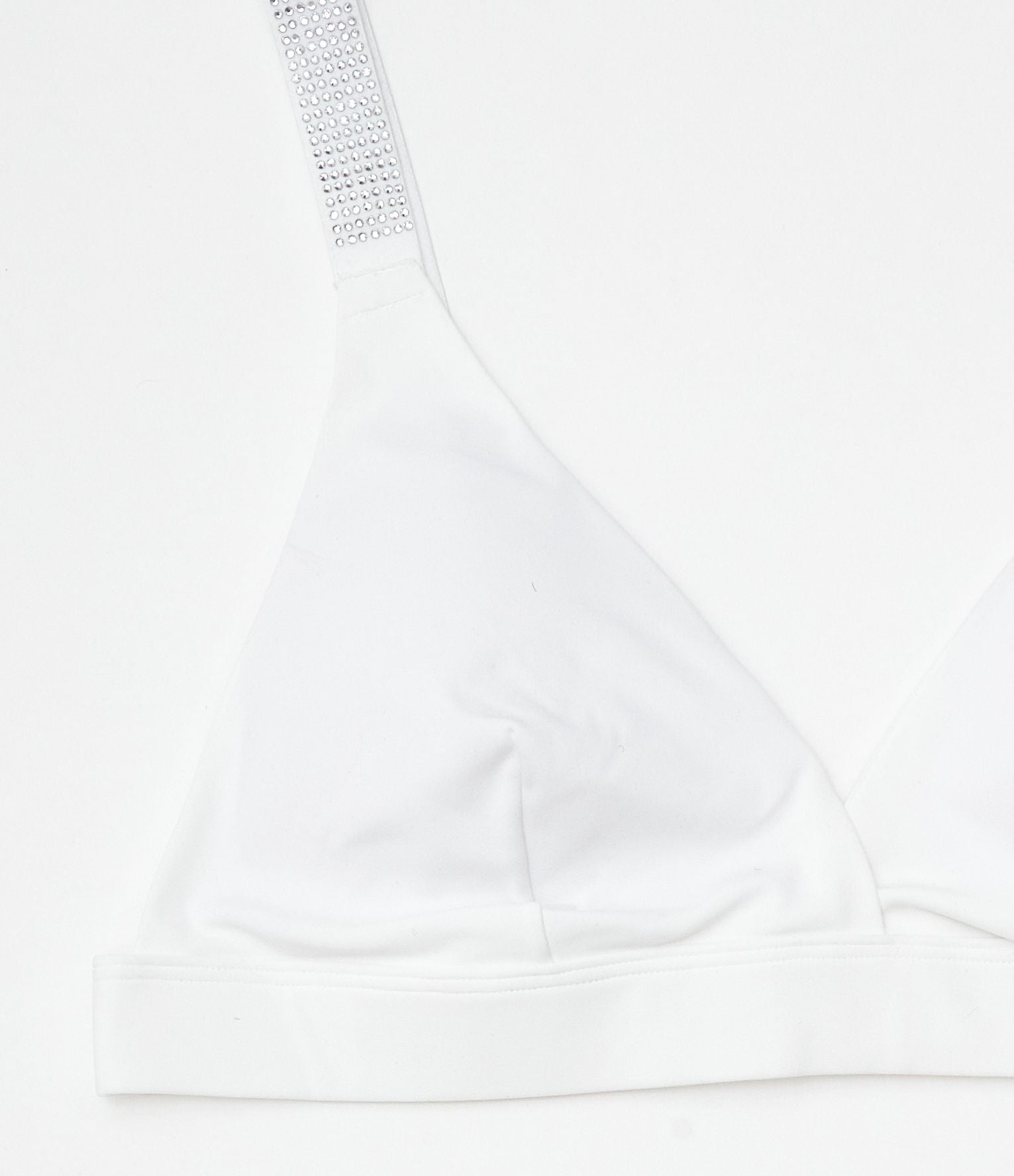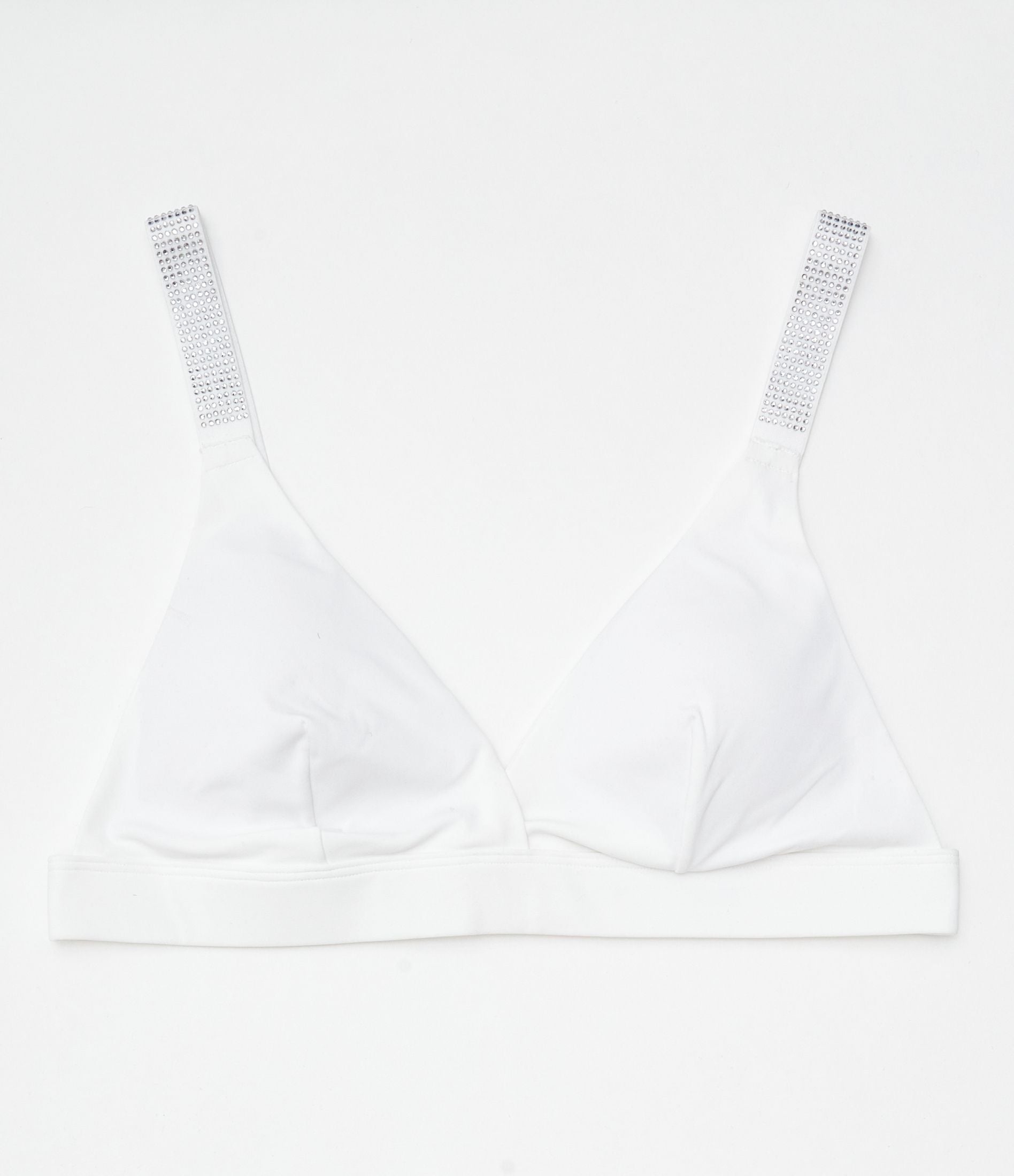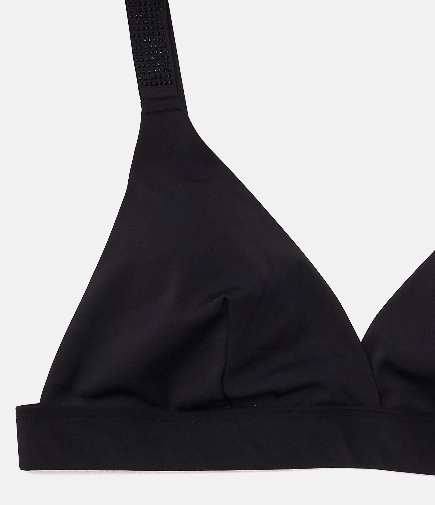 Reggiseno modello a triangolo con coppa rimovibile e spalline con strass regolabili. Chiusura con due gancetti regolabili in tre larghezze.