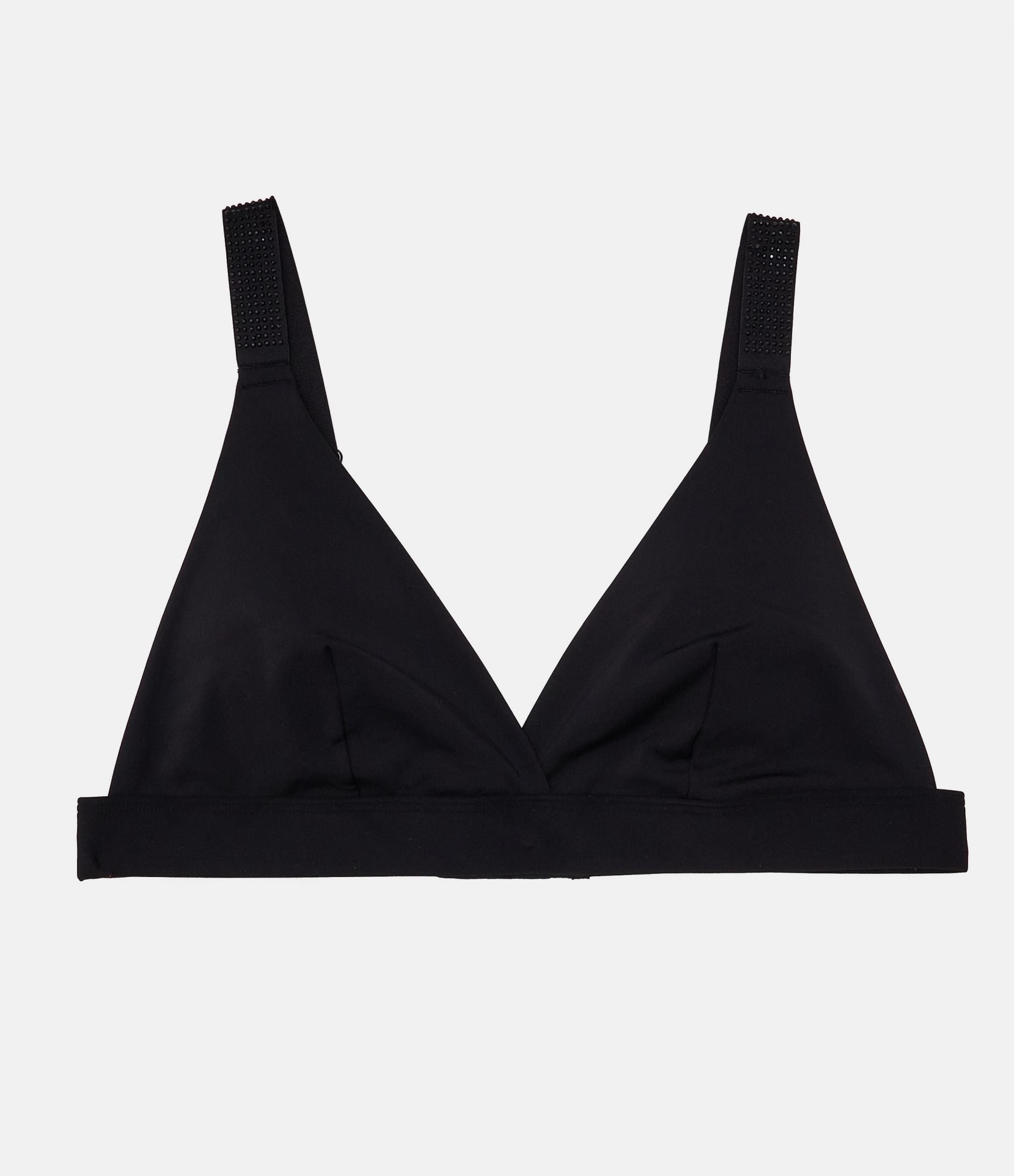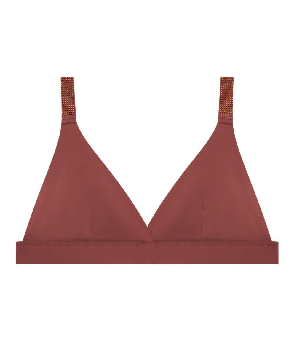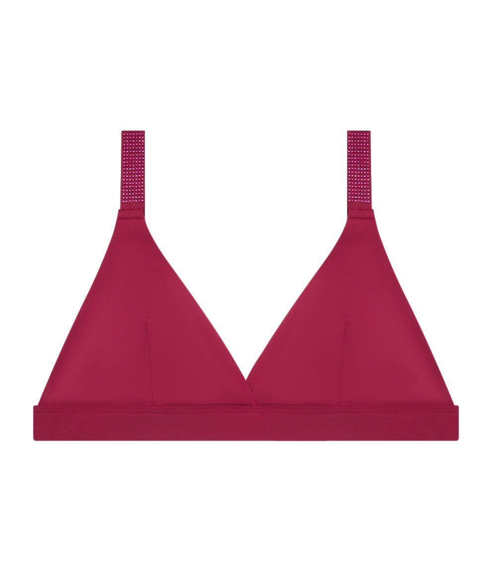 Reggiseno modello a triangolo con coppa rimovibile e spalline con strass regolabili. Chiusura con due gancetti regolabili in tre larghezze.