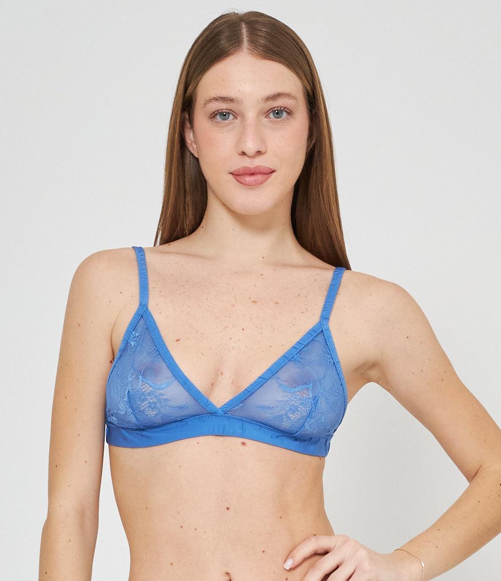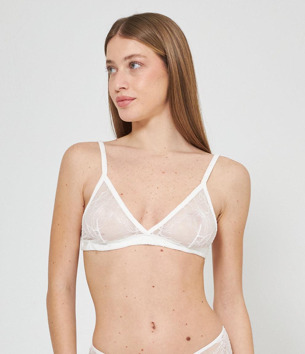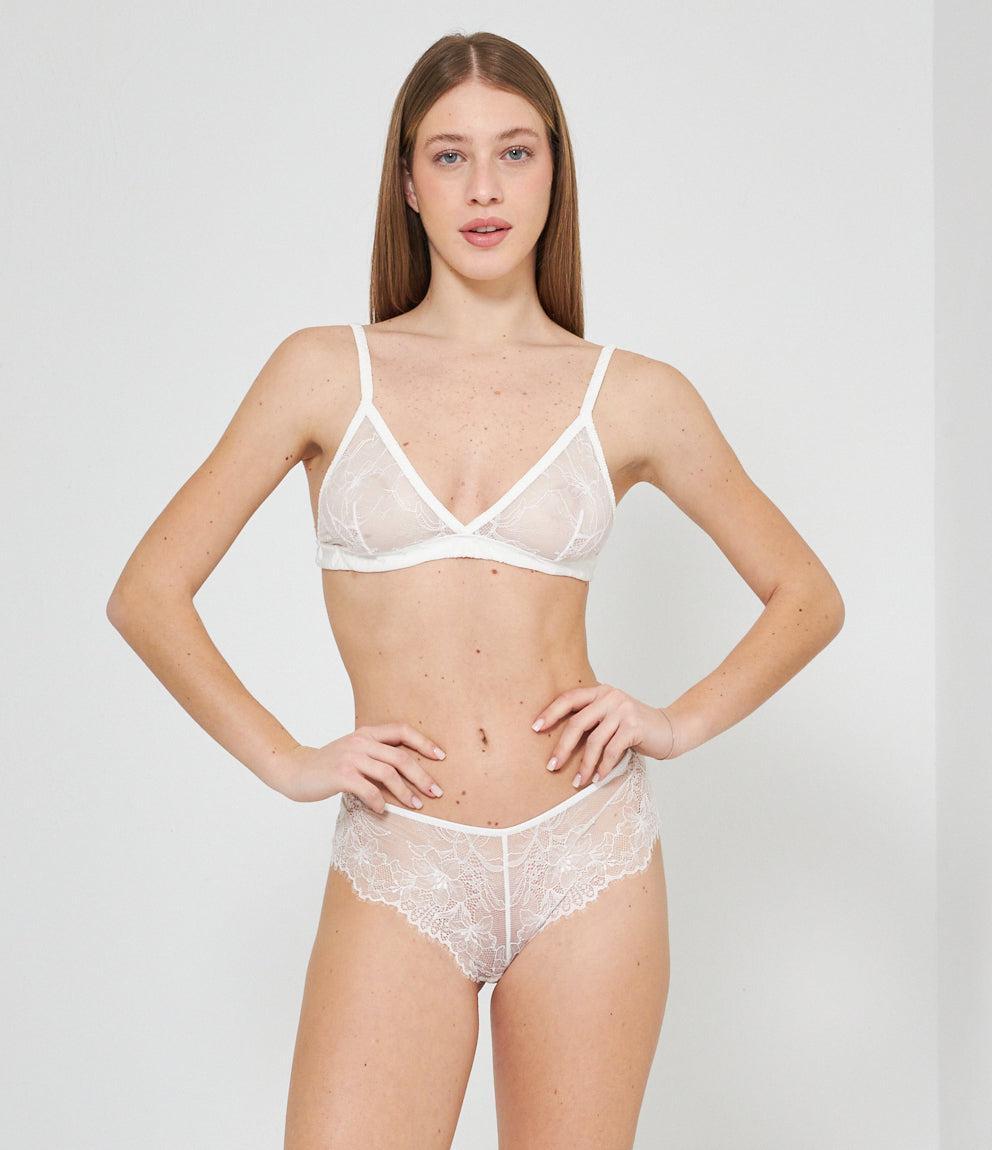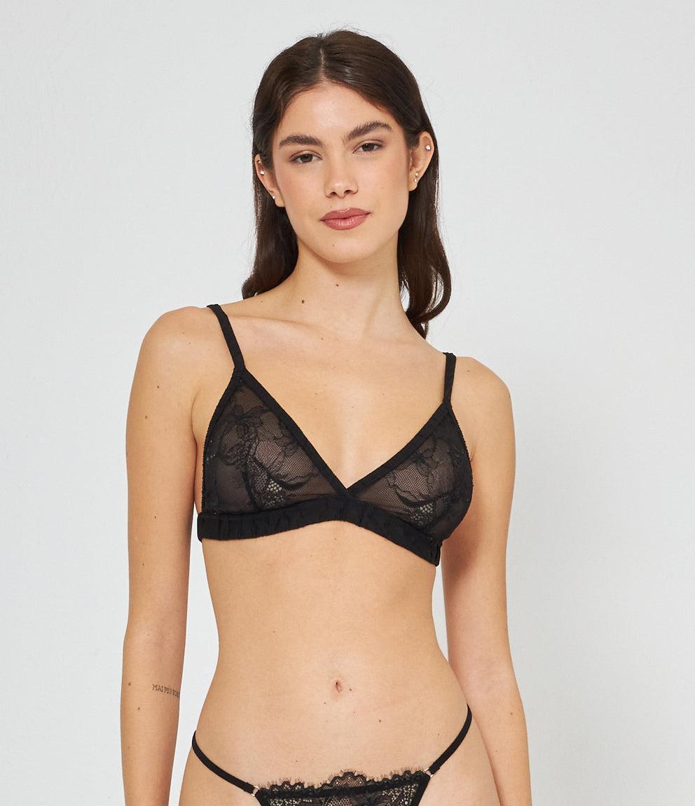 Reggiseno in pizzo trasparente con spalline elastiche regolabili e chiusura con due gancetti regolabili in tra larghezze.