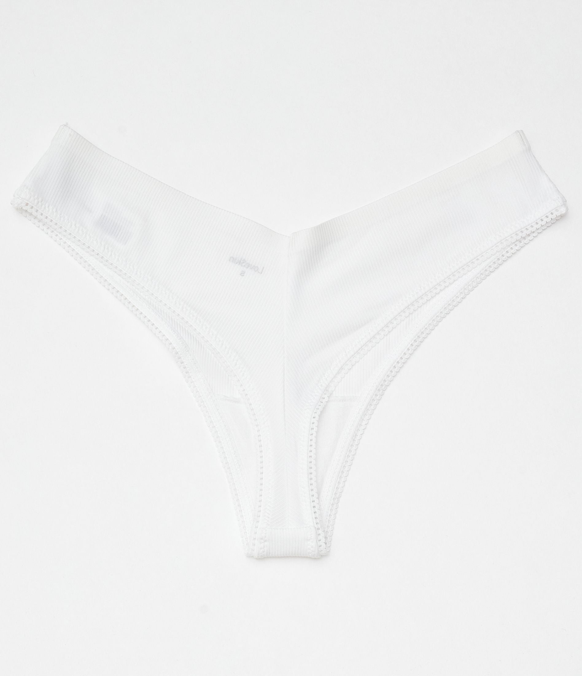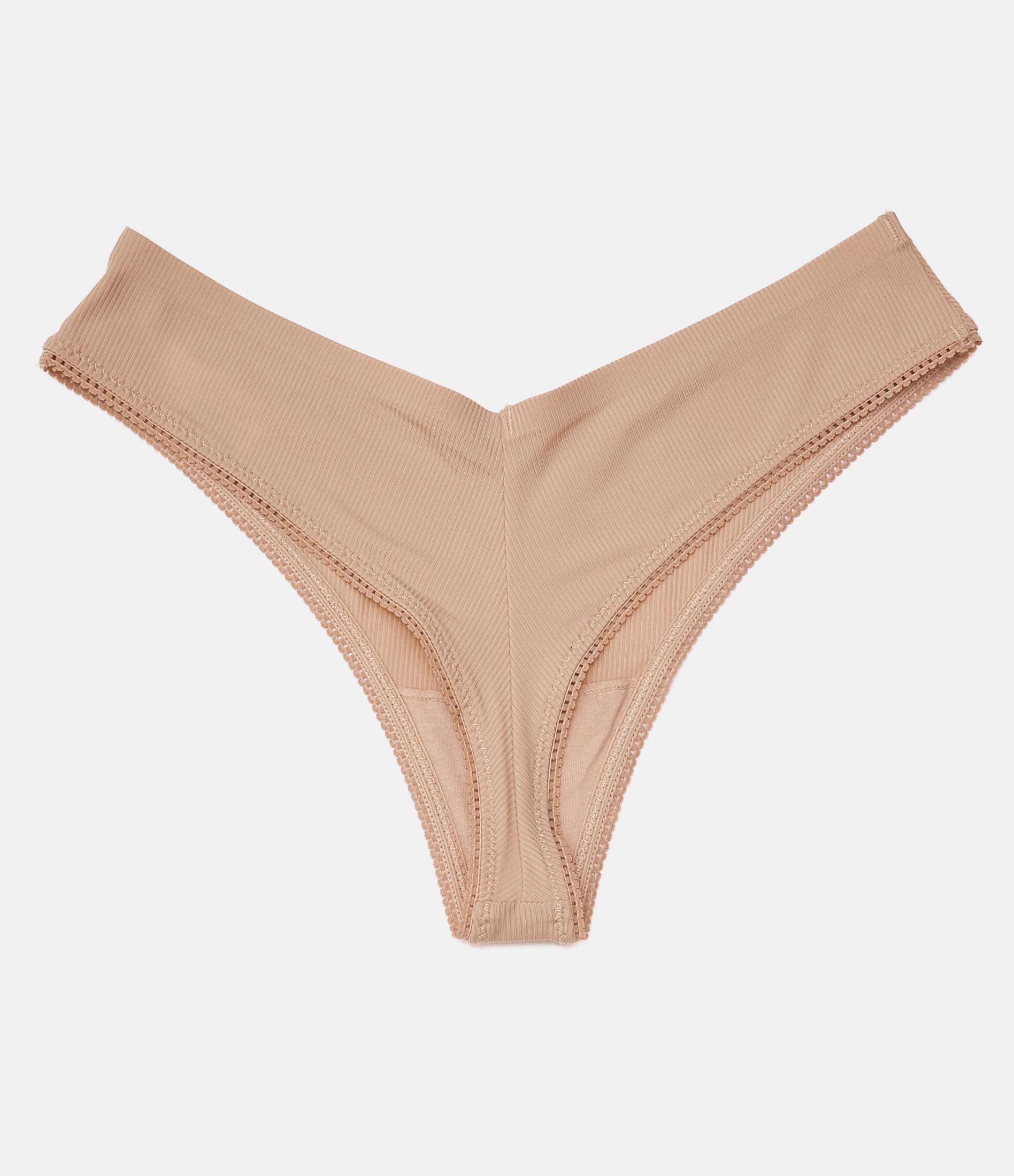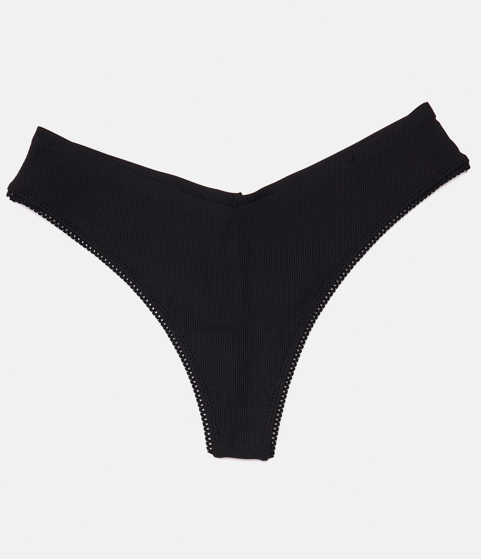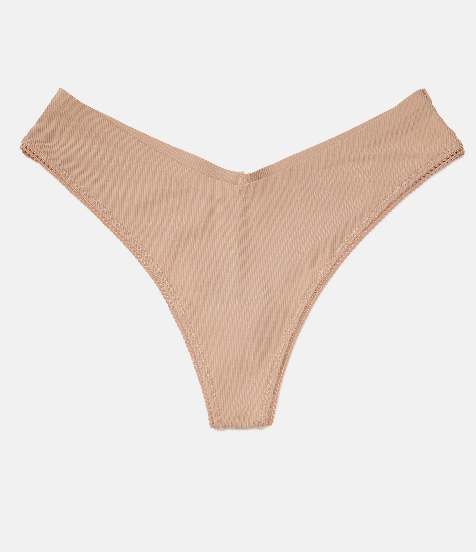 Slip modello brasiliana a costine, a V con bordi inferiori lavorati e cucitura posteriore.