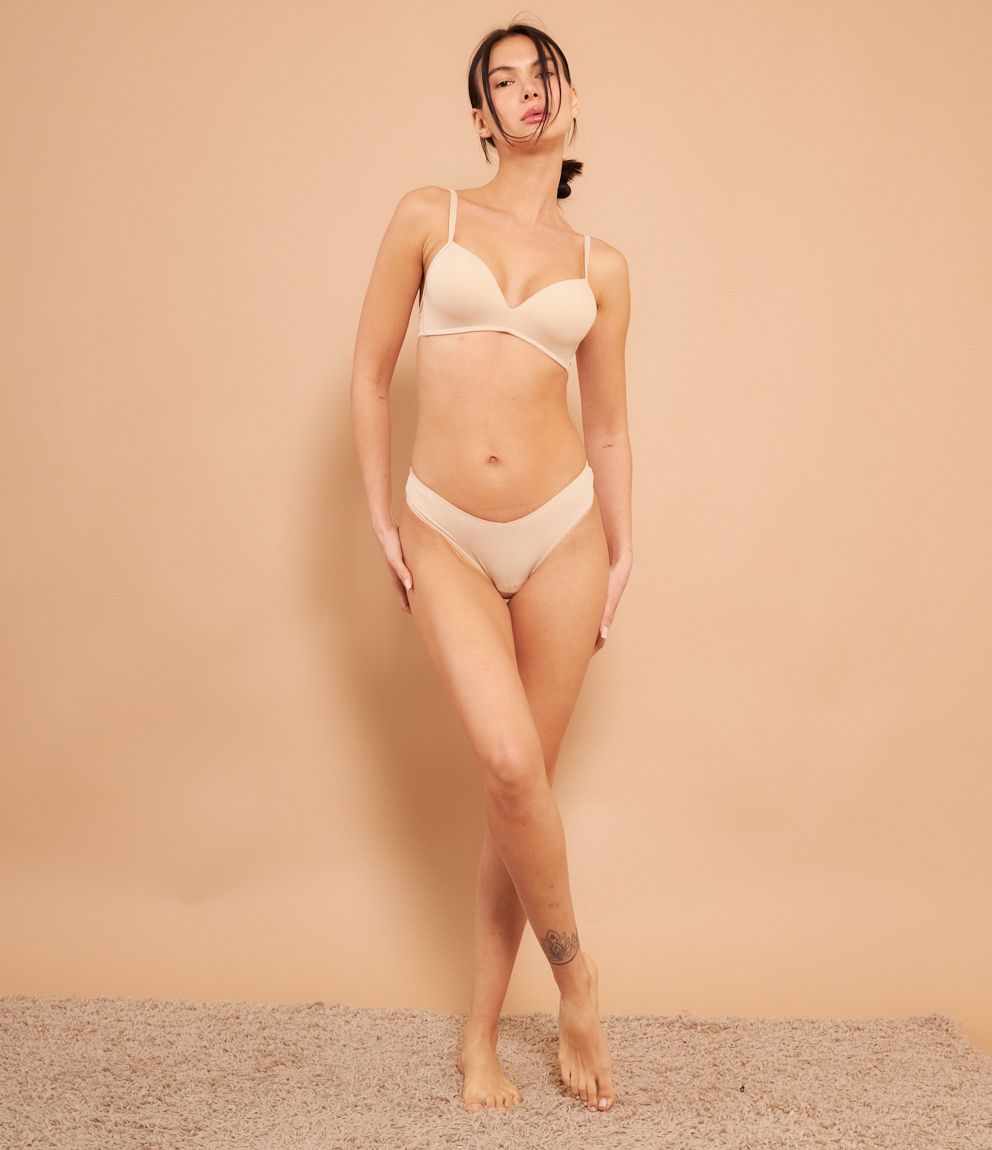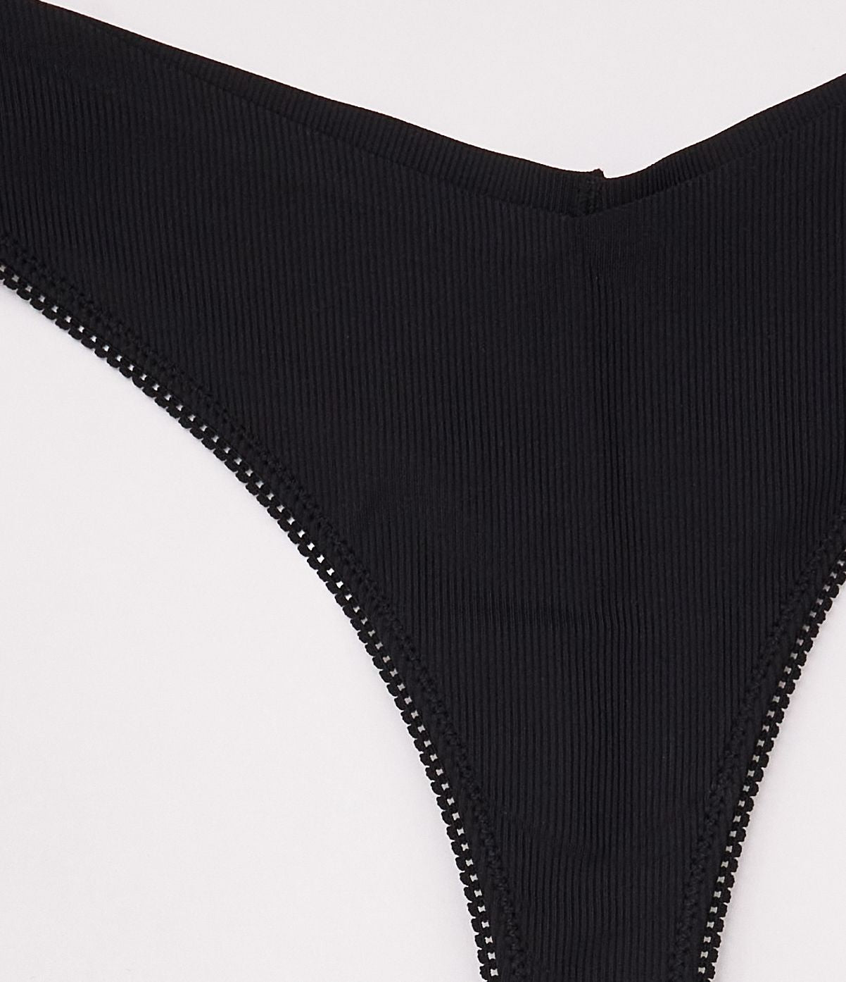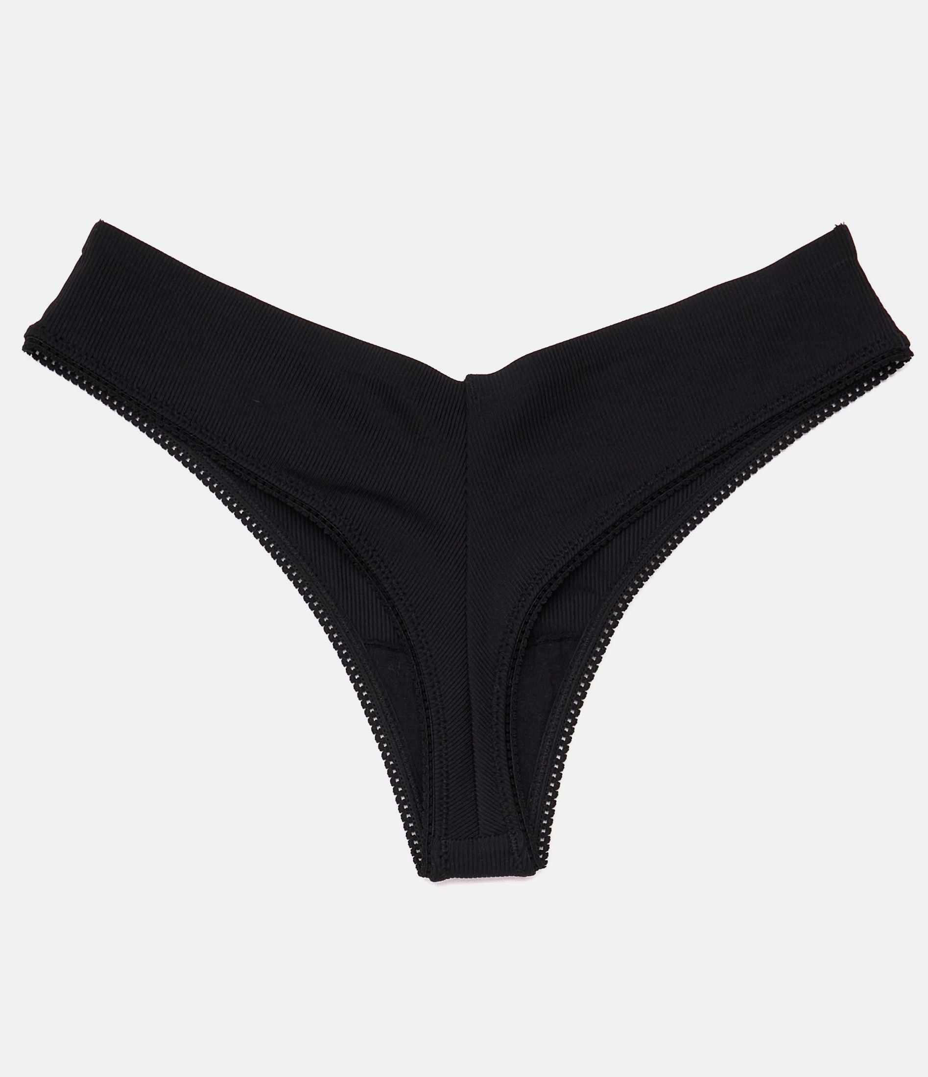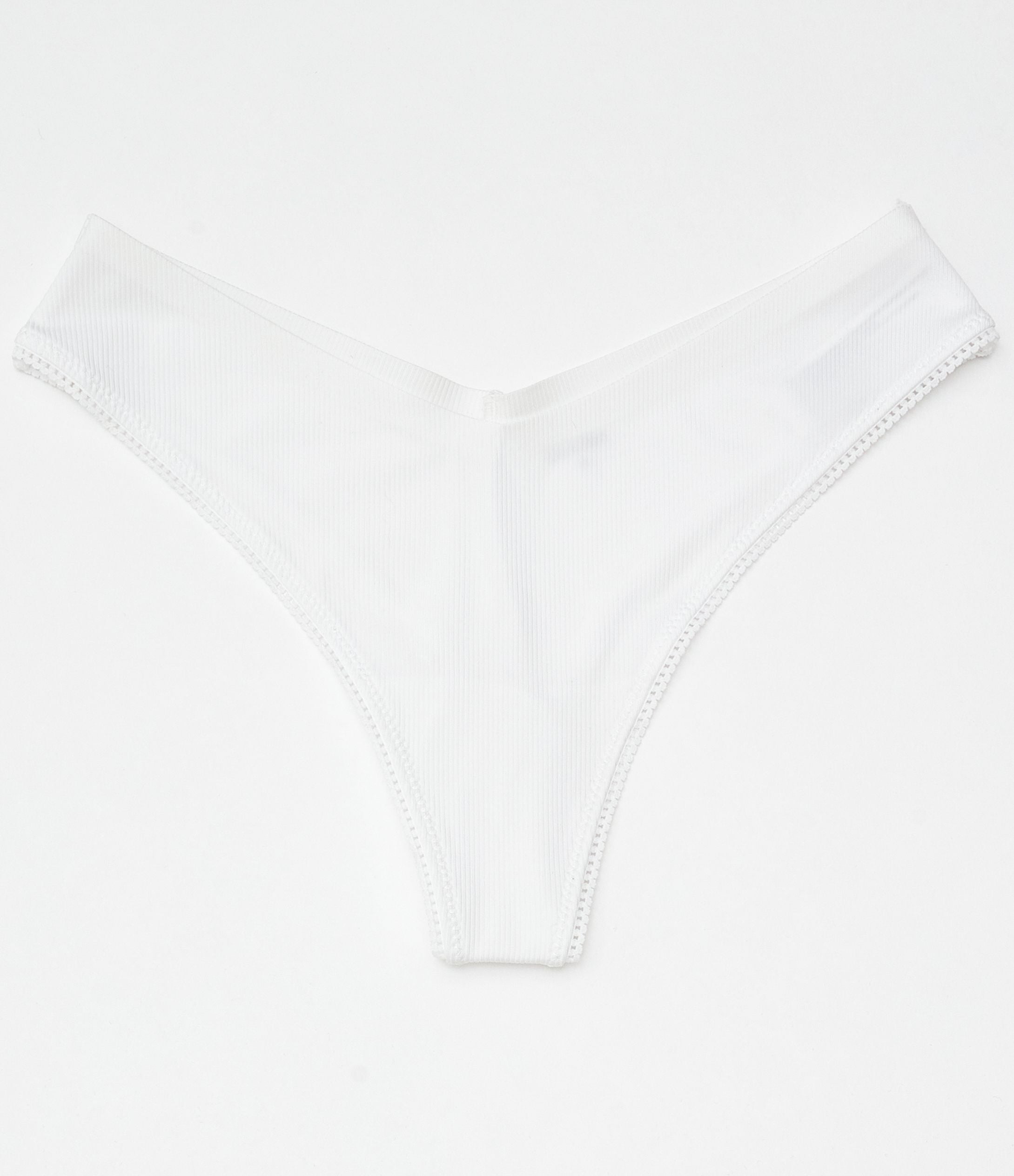 Slip modello brasiliana a costine, a V con bordi inferiori lavorati e cucitura posteriore.