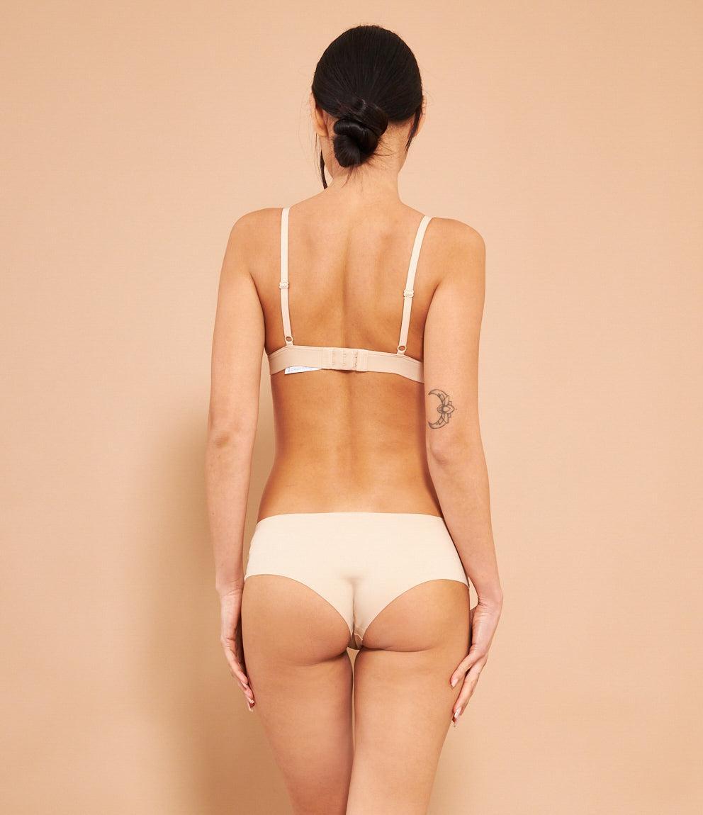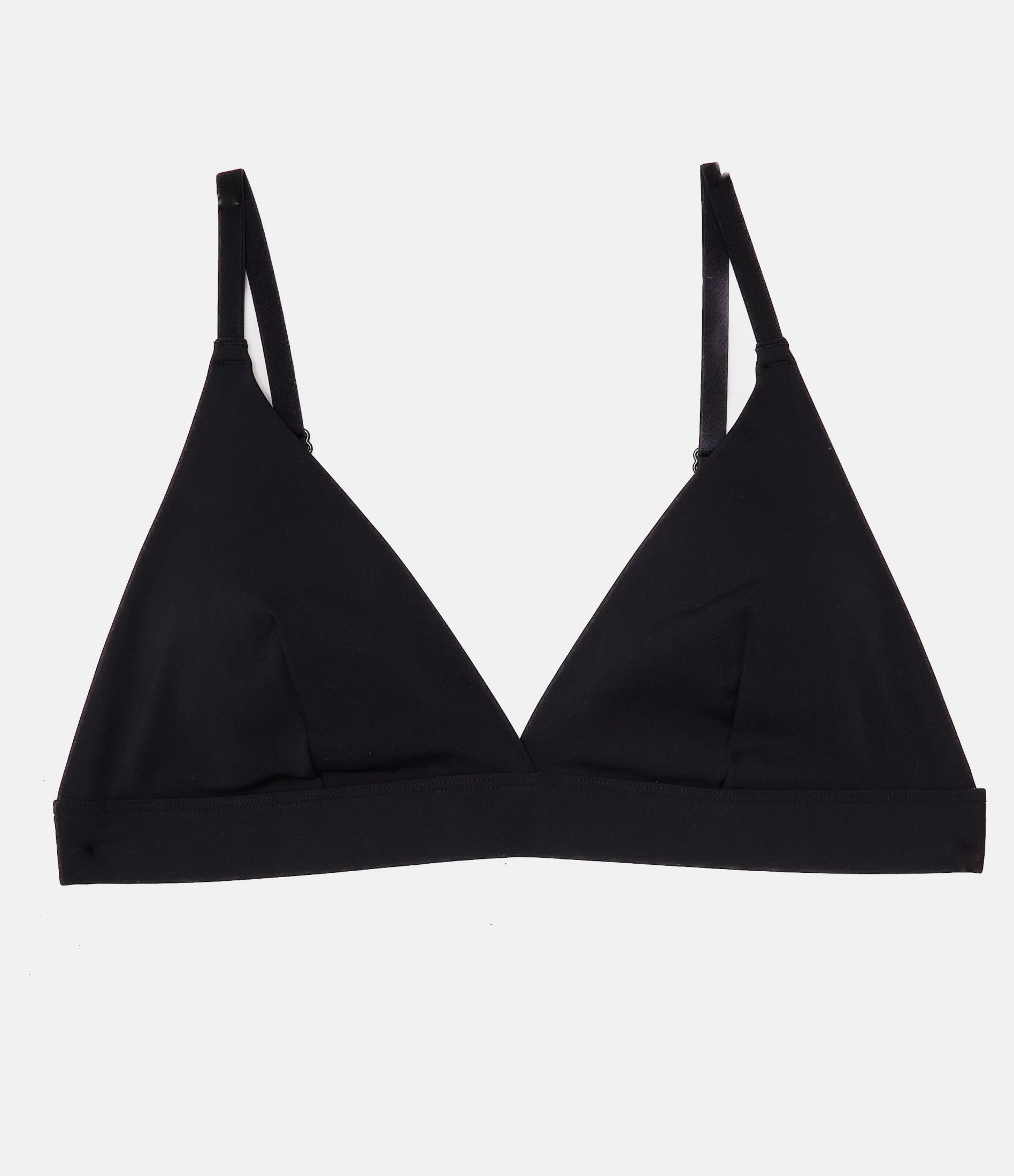 Reggiseno modello a triangolo con coppe rimovibili, spalline regolabili e chiusura con due gancetti regolabili in tre larghezze.