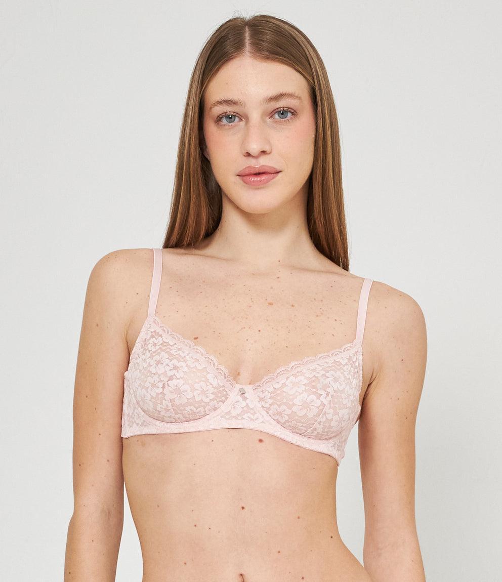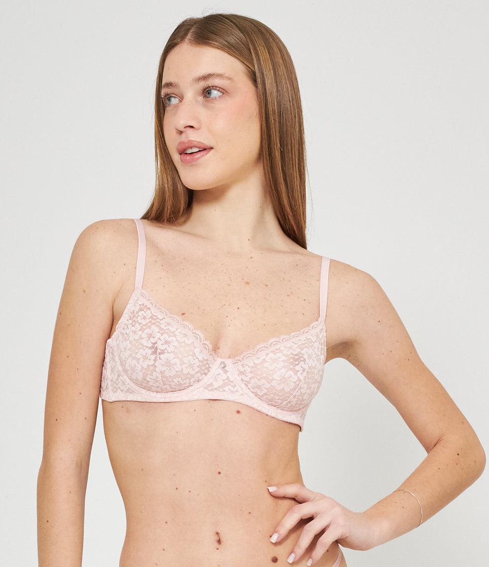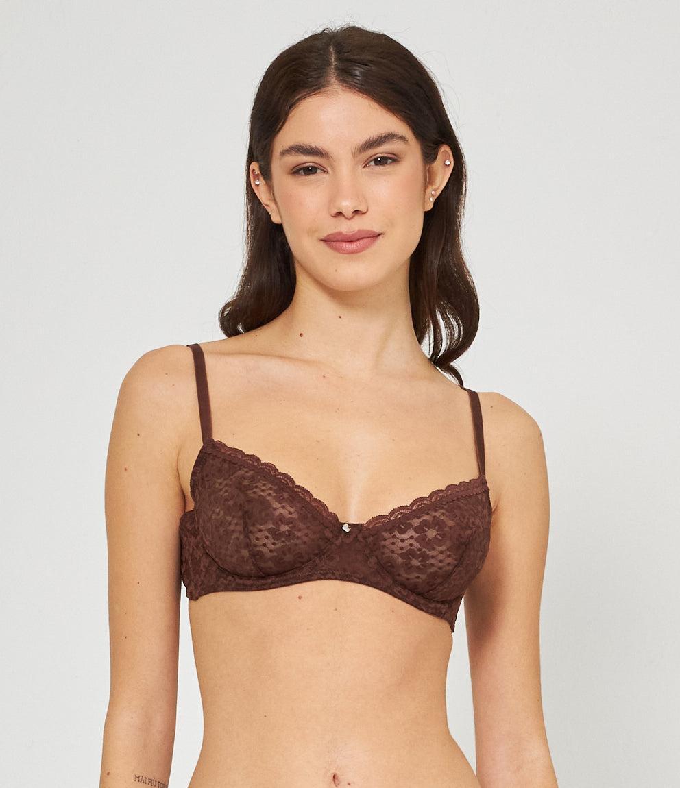 Lace balconette bra with adjustable straps and a closure with two hooks adjustable to three widths.