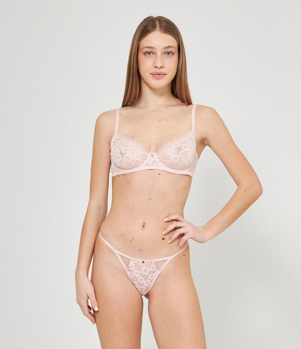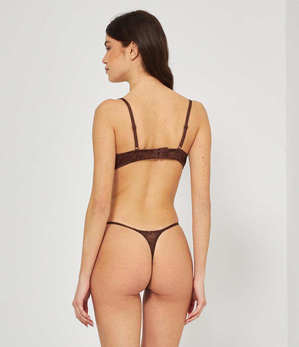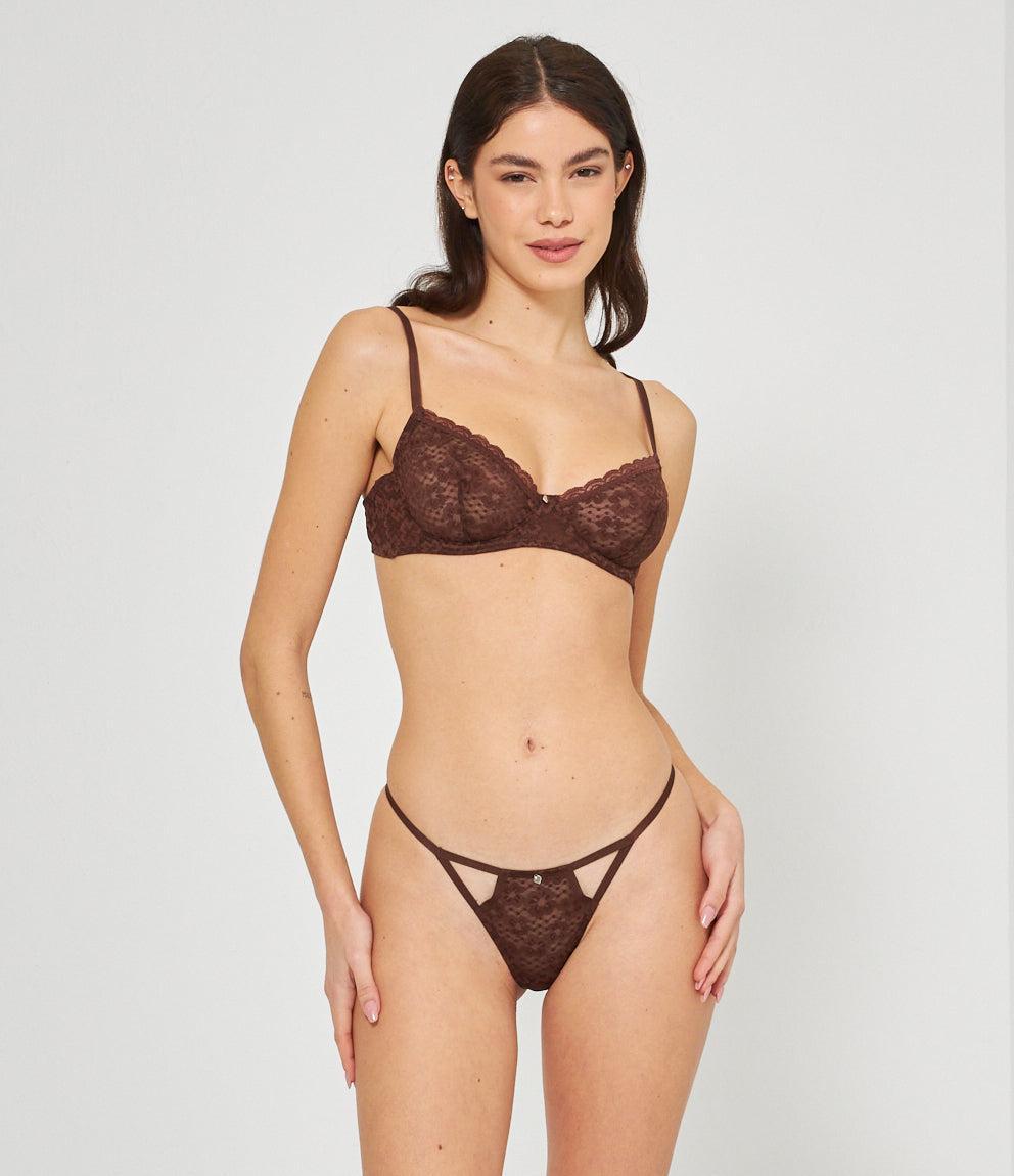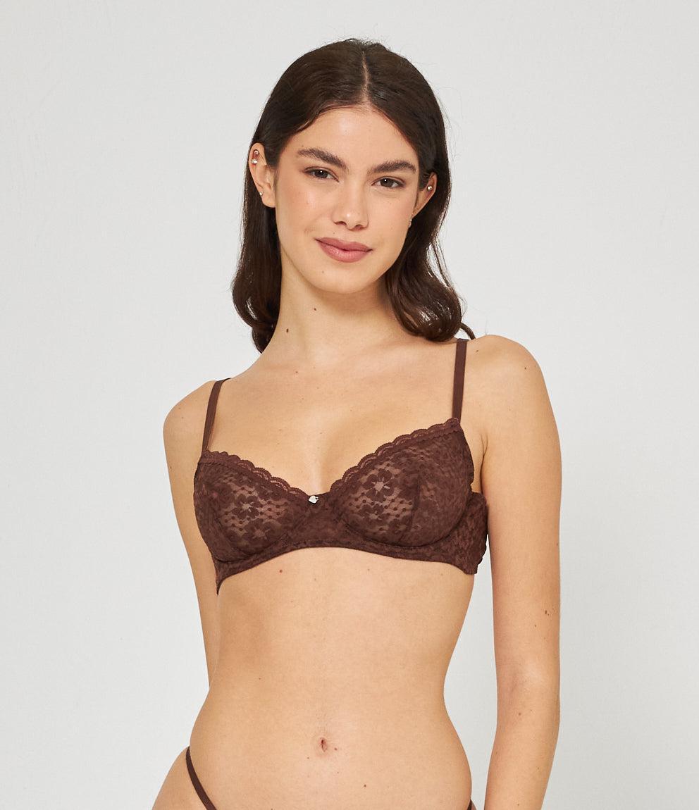 Lace balconette bra with adjustable straps and a closure with two hooks adjustable to three widths.