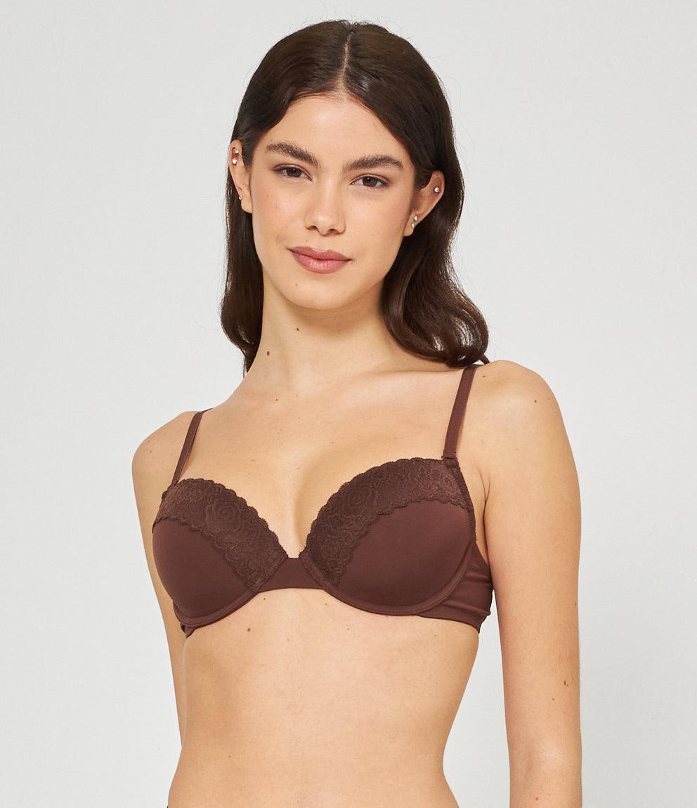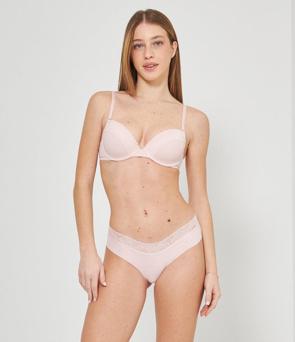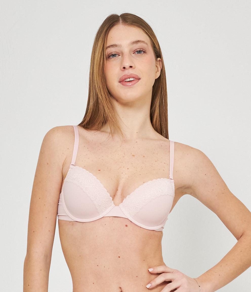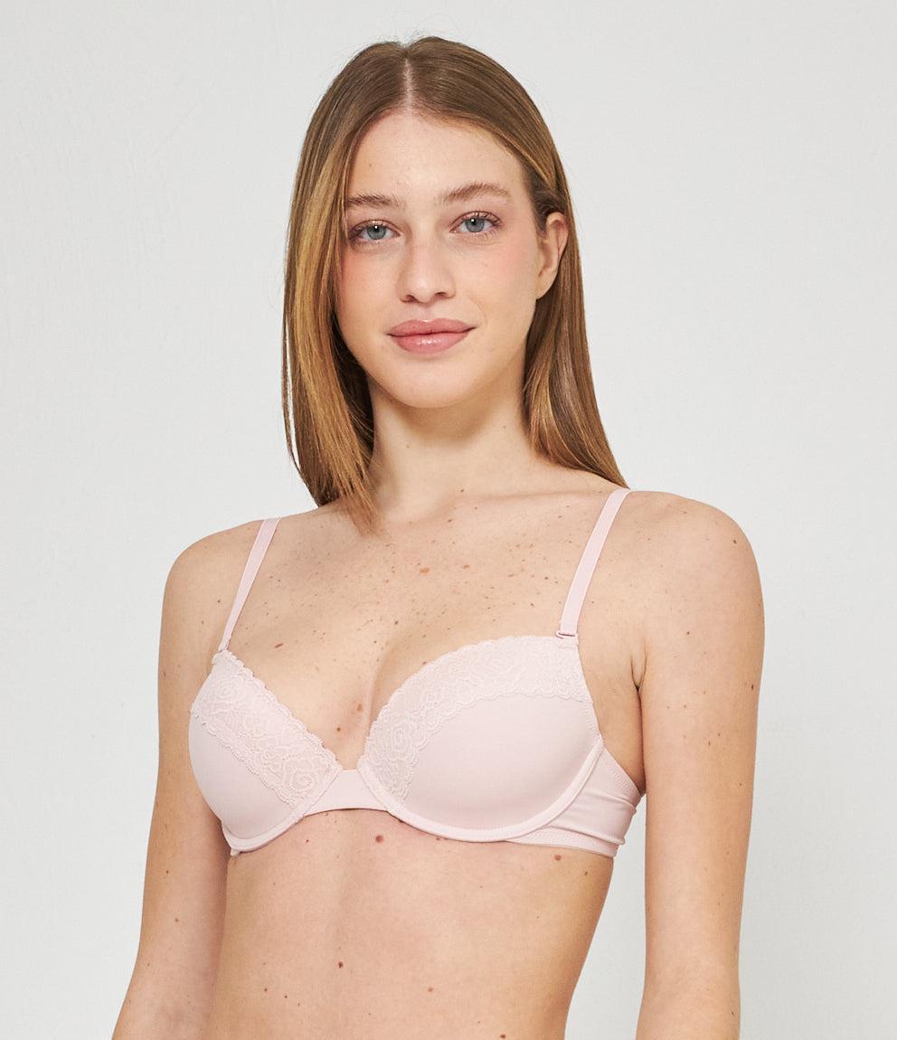 Push-up bra with lace trim and internal padding. Features adjustable and removable straps. Closure with two hooks adjustable to three widths.
