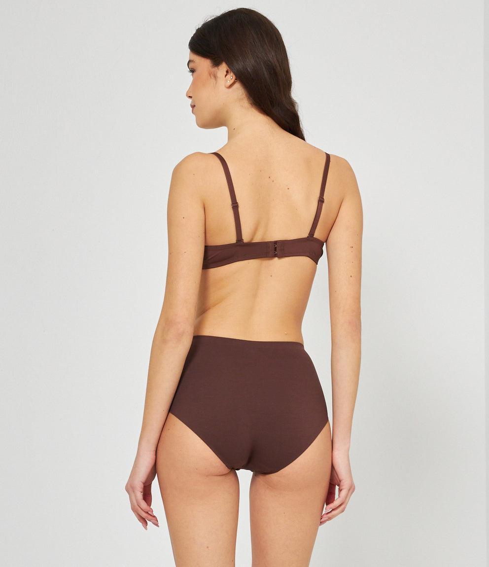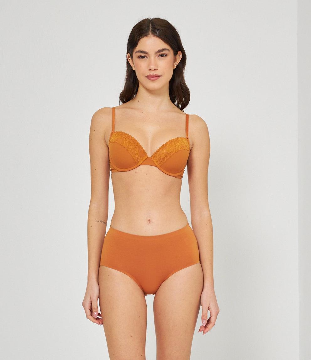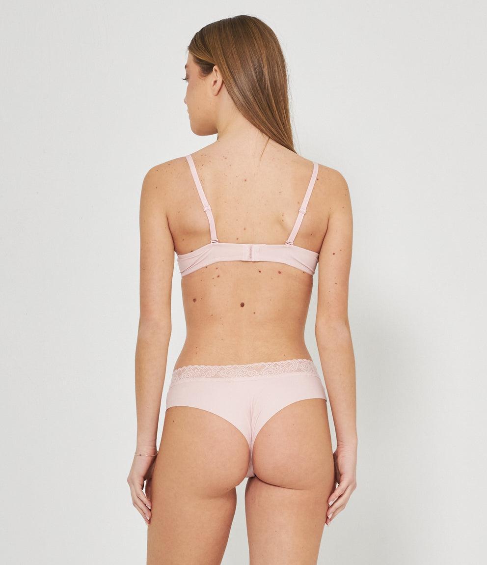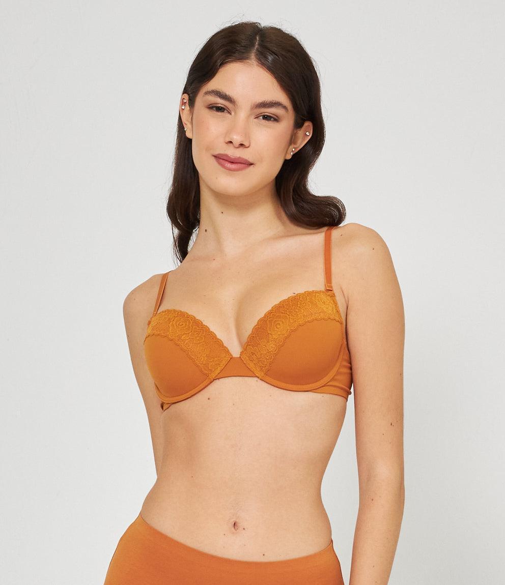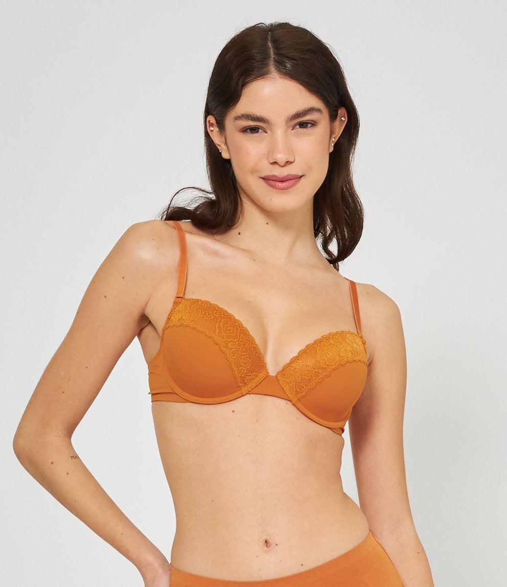 Push-up bra with lace trim and internal padding. Features adjustable and removable straps. Closure with two hooks adjustable to three widths.