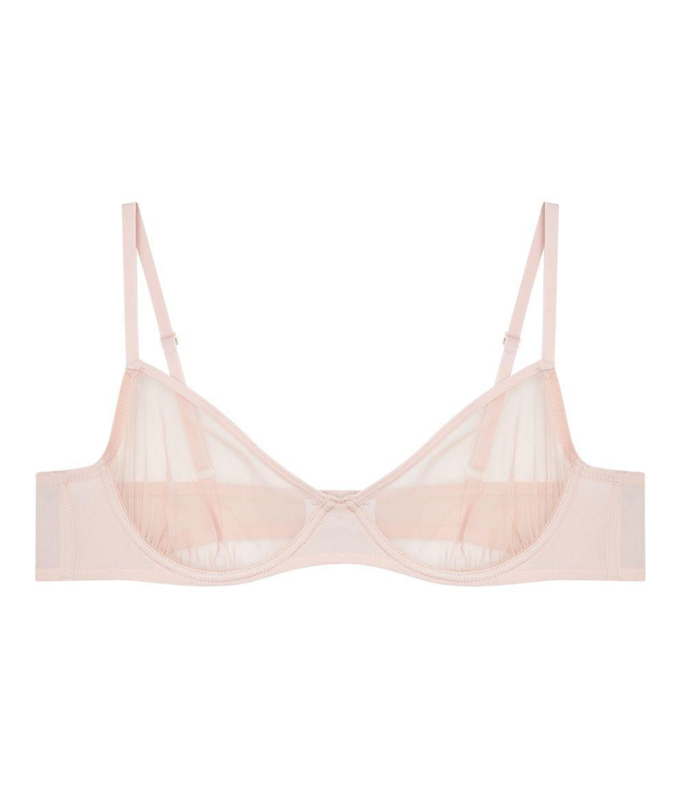 Reggiseno a balconcino in tulle trasparente. Spalline regolabili e chiusura con due gancetti regolabili su tre larghezze.