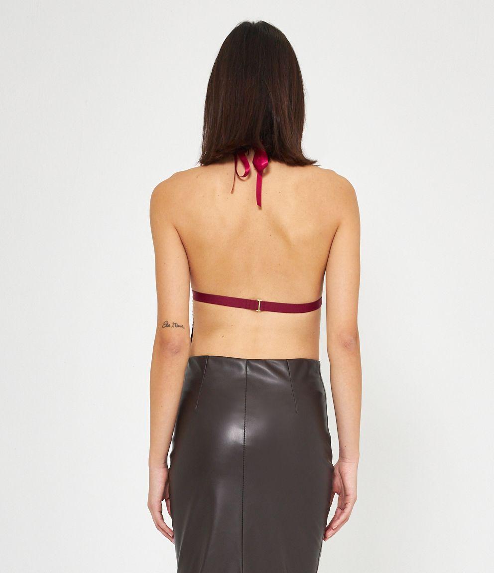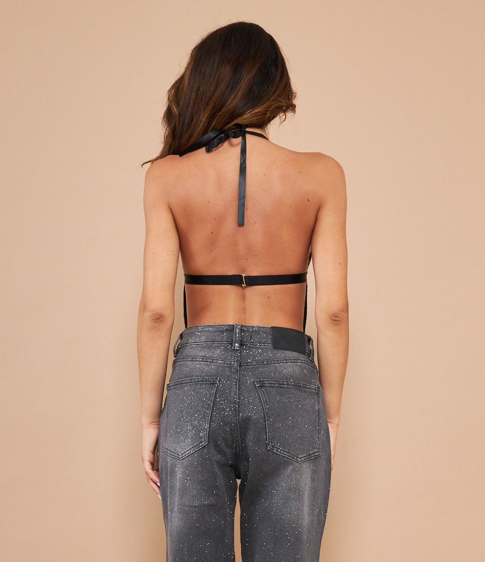 Body in pizzo trasparente con schiena scoperta. chiusura sul retro con gancio e al collo con lacci regolabili.