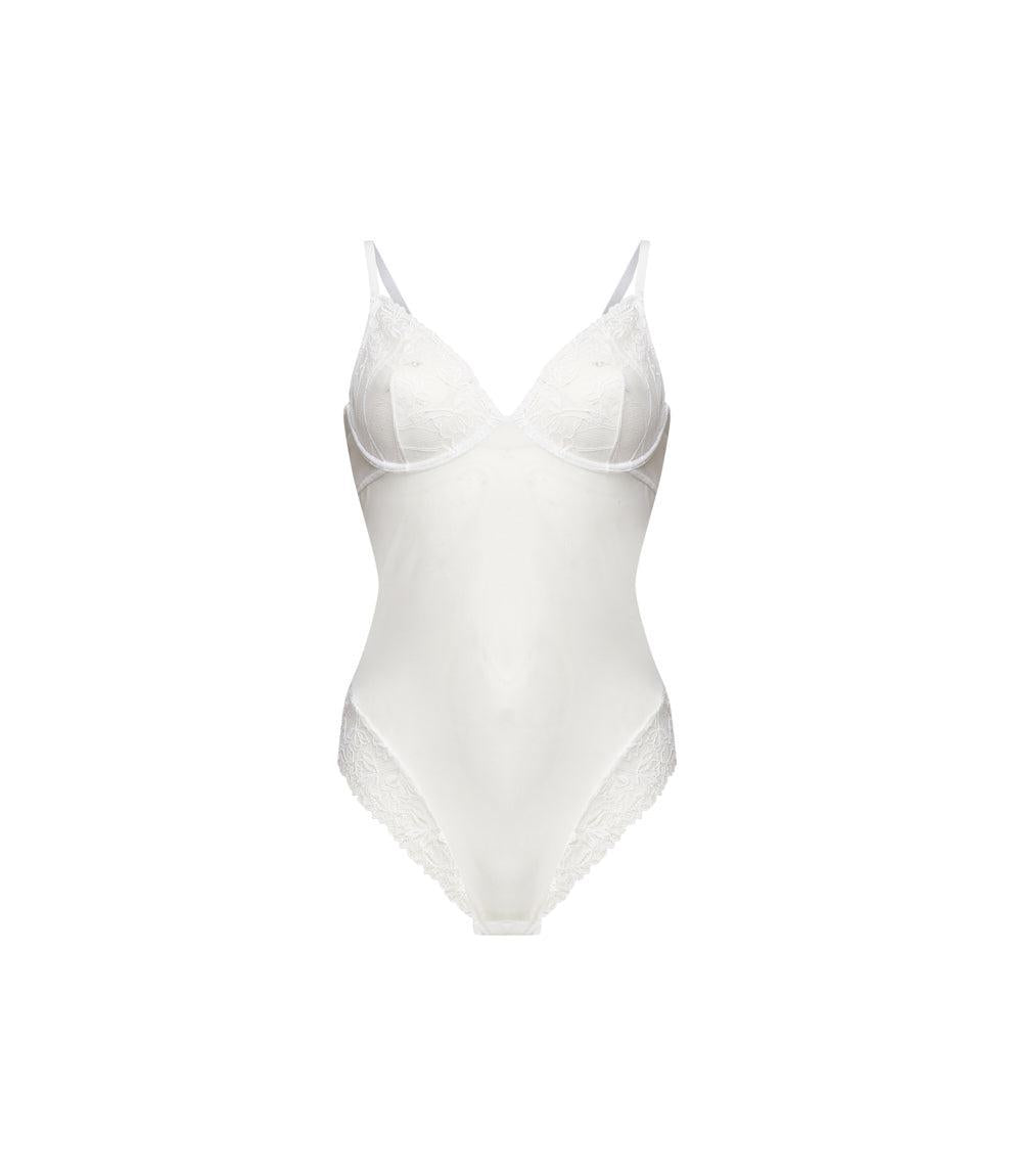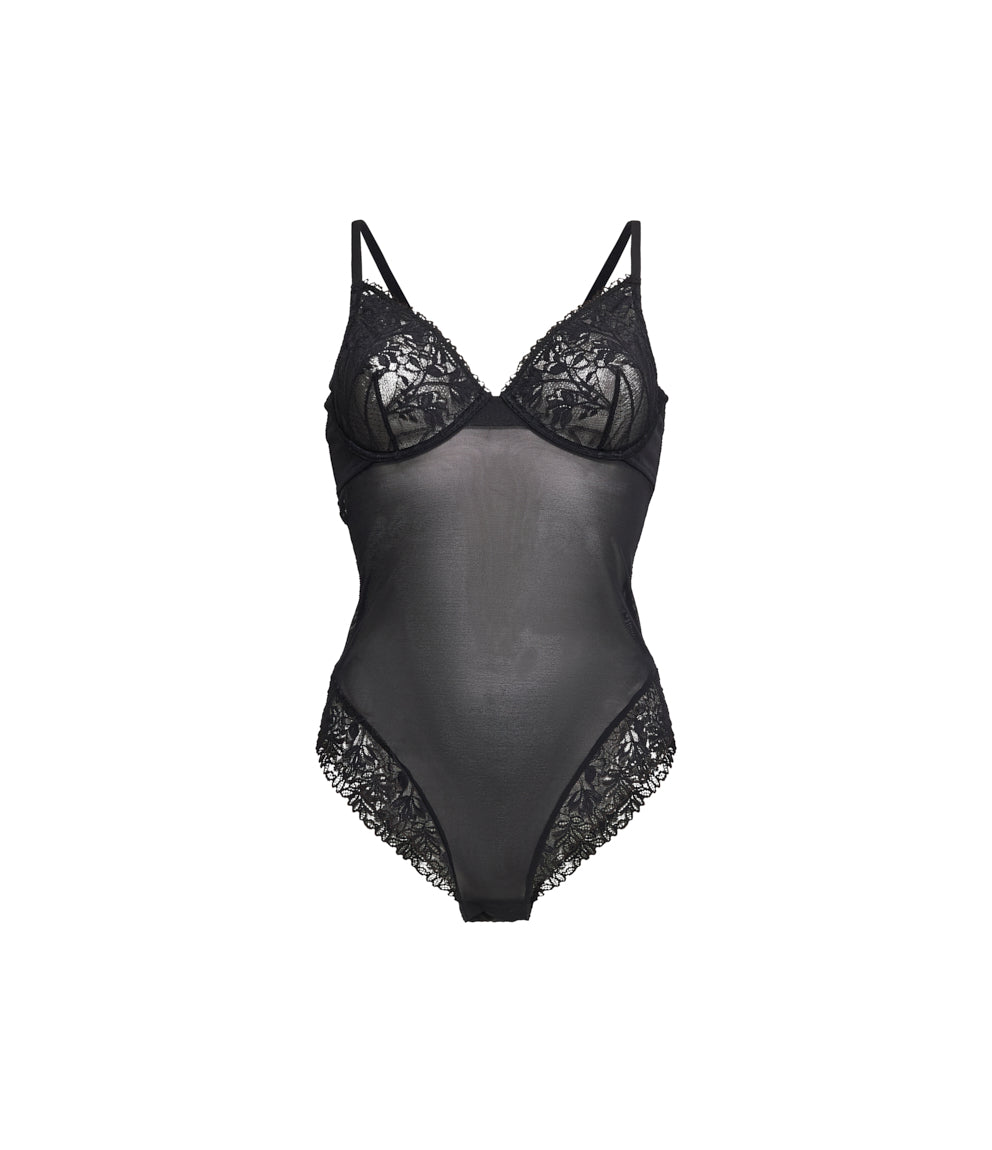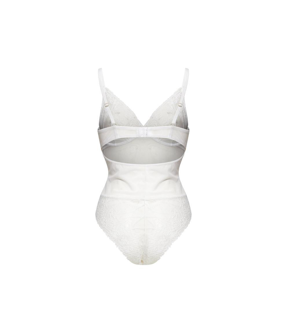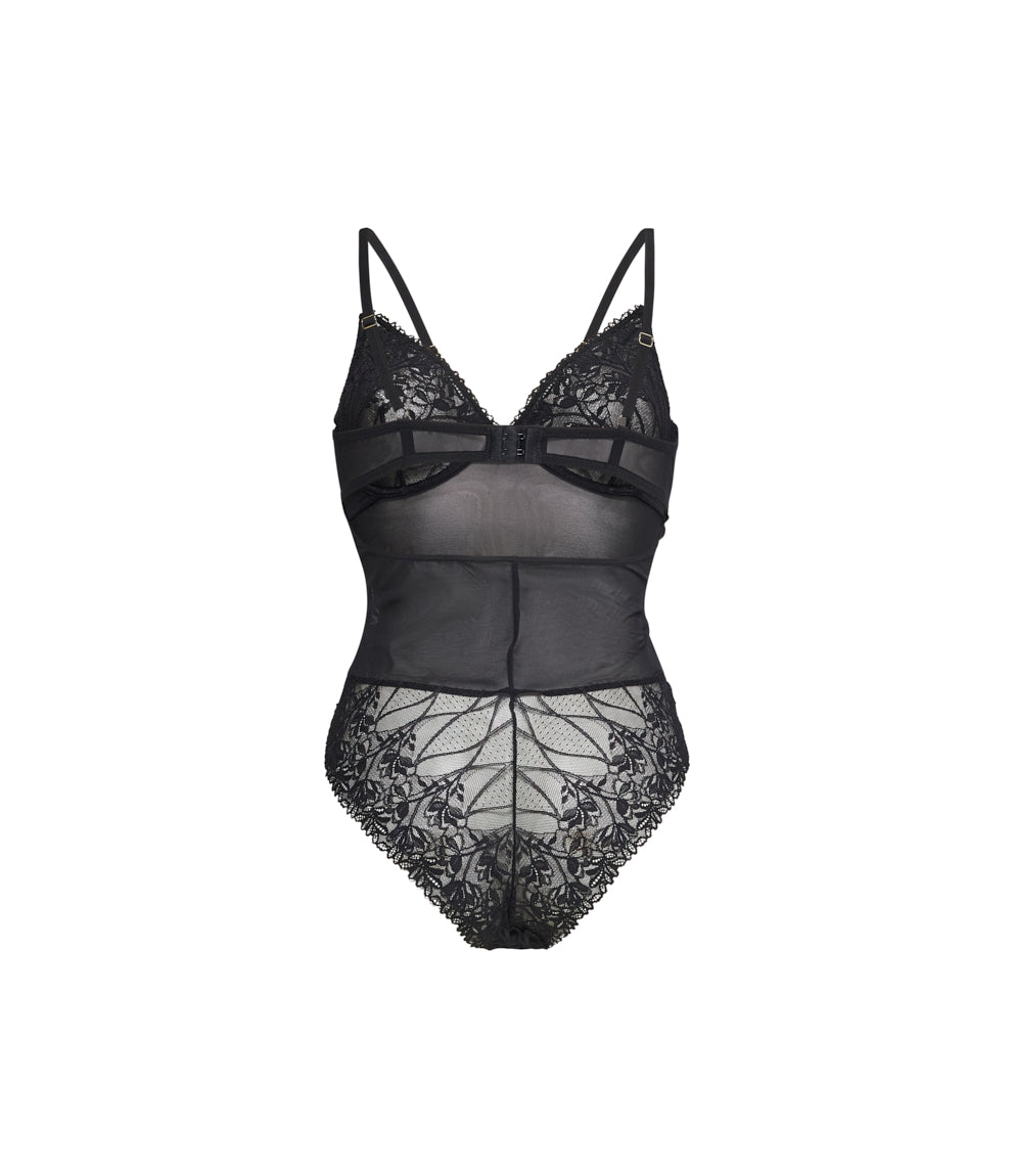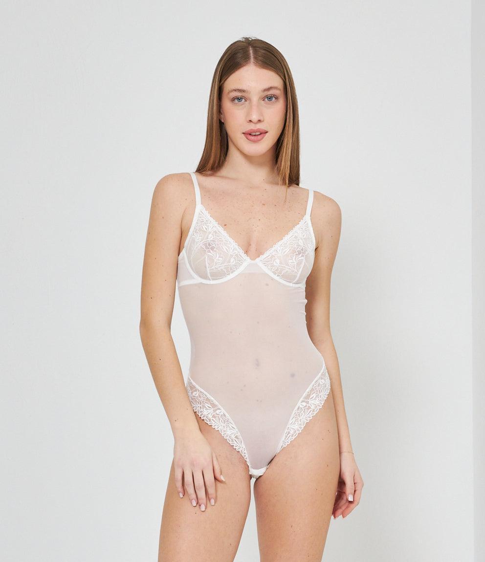 Body in microrete e dettagli in pizzo, spalline regolabili e chiusura con due gancetti regolabili in tre larghezze.